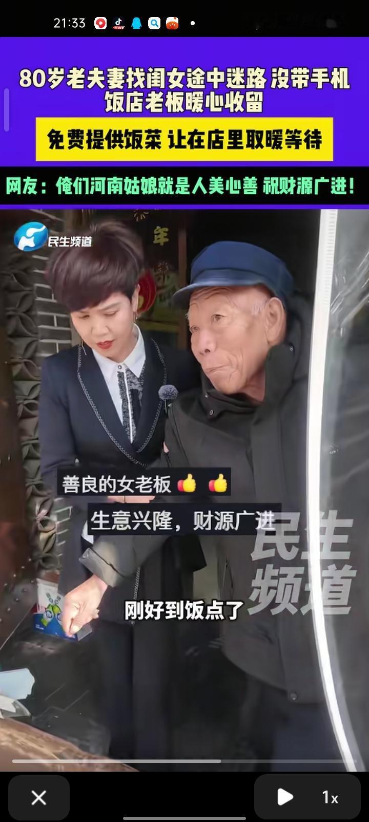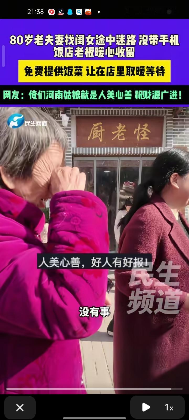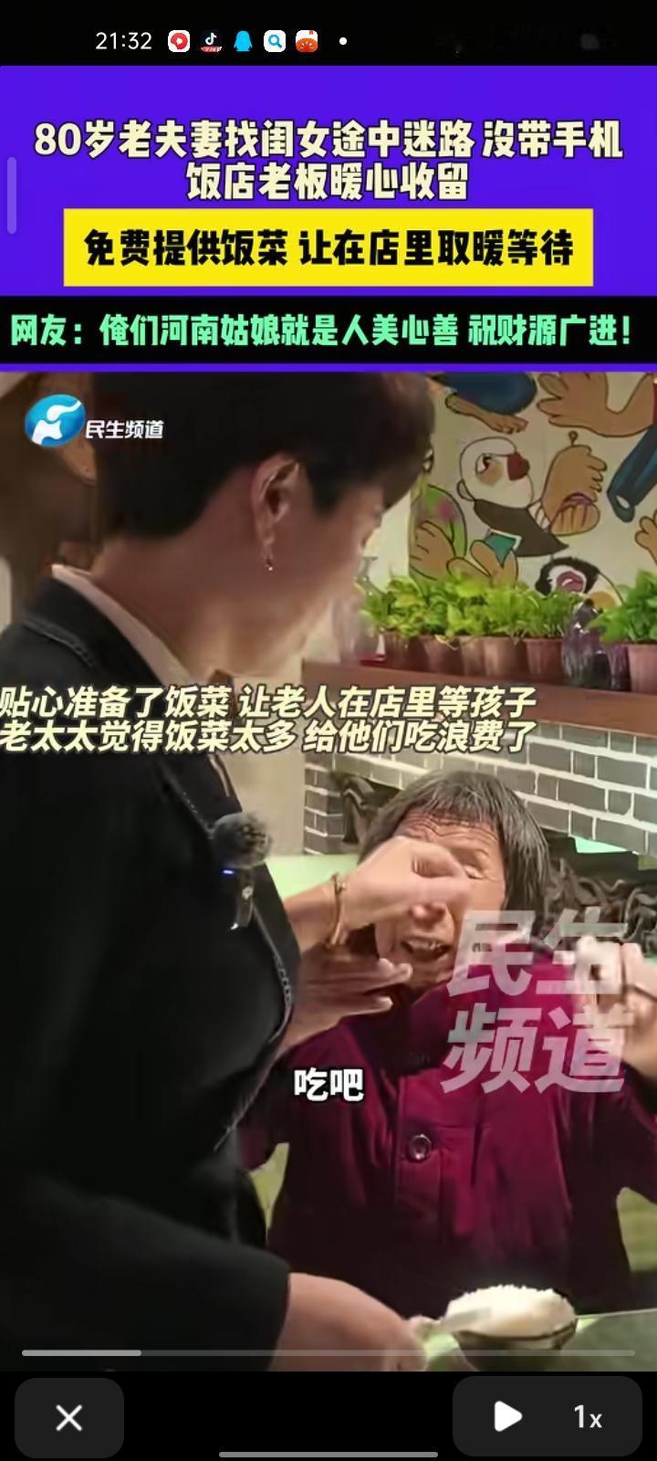 11月15日,洛阳市新安县。八旬老夫妻去闺女家半途迷路,也没带手机,饭店老板暖心收留,为他们免费提供饭菜,让他们在店里等待。老太太觉得饭菜太多,给他们吃浪费了,就拨了一点菜到碗里,老板将剩下的打包让她带走。 老夫妻吃完饭后,老板联系了家人,家人随后赶来了。没有掏钱,老人心里过意不去,老板暖心安抚。最后,老夫妻道谢完后就骑着三轮车走了
