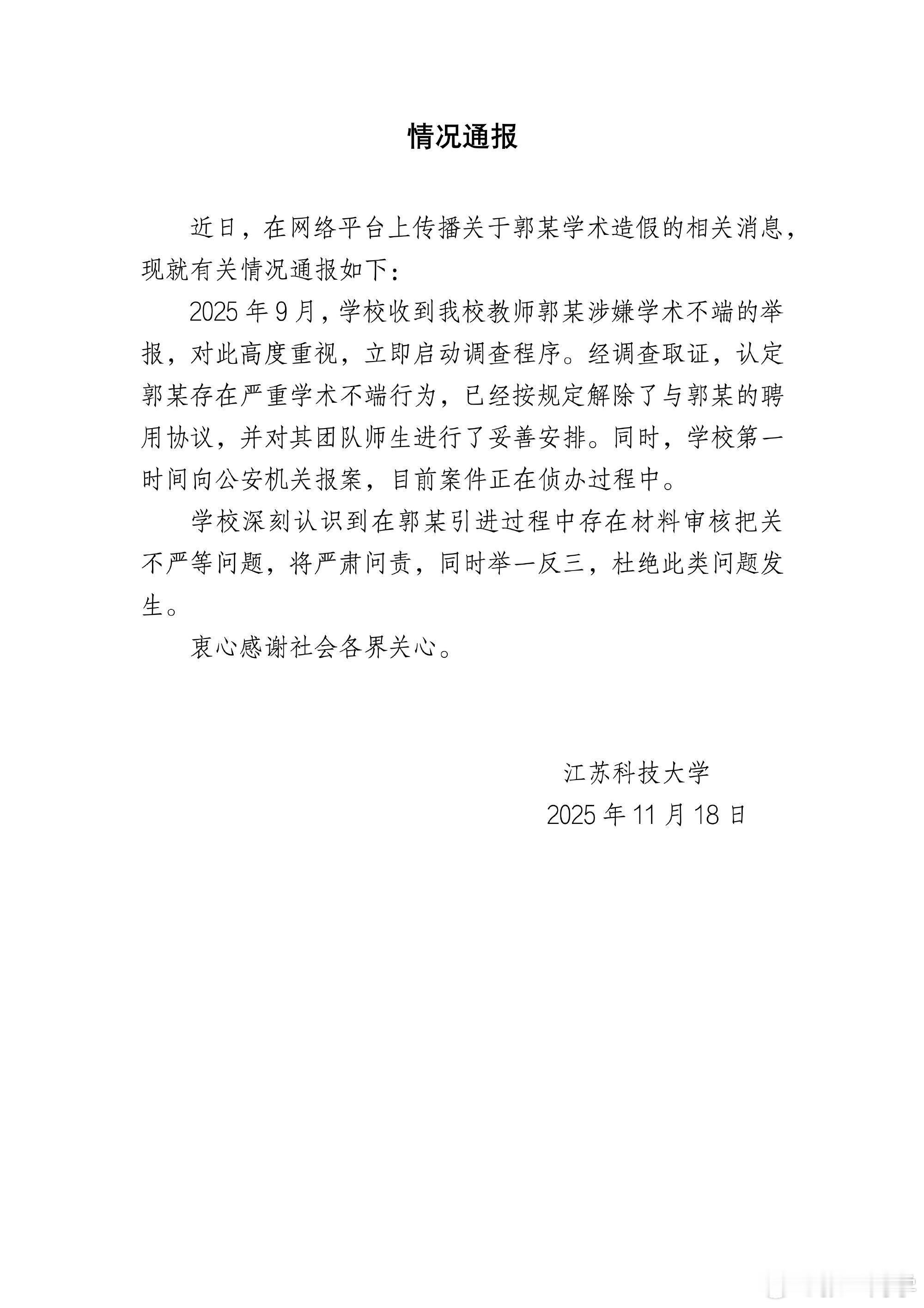 江苏科技大学“郭伟事件”,其实挺严重的,除了高校培养制度,还直指学术圈行政官僚化。首席科学家带有团队和博士,混了2年才被发现,有人说把一只猴栓在学阀的位置上,都可以“正常”运转。仅看学校通报,还以为是一起简单的学术不端事件。9月份就被发现,近期被网络曝光才通报,说明学校想冷处理!解聘、报警,学校似乎不会再公开说明情况了。