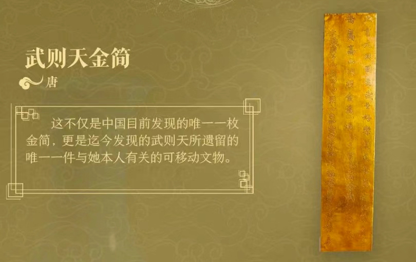 【】 在热播剧《唐朝诡事录之长安》里,出现了一件贼拉硬核的国宝,武则天金简(女皇帝所遗留的唯一一件与她本人有关的可移动文物)。这件文物原型藏于河南博物院,目前在2楼7展厅展出。金简长度为36.2厘米,宽8厘米,重223.5克,90%高纯度黄金制作而成,上面主要内容为武则天祈福苍生。共载有63个铭文。影视剧中,金简被投掷于嵩山,与它的真实命运高度吻合。千百年过去,朝代更迭、山川依旧,1982年,登封县嵩山的一名农民在山间采药时在石缝中偶然发现了这枚金简,随后上交给登封的文物主管部门。(河南博物院)