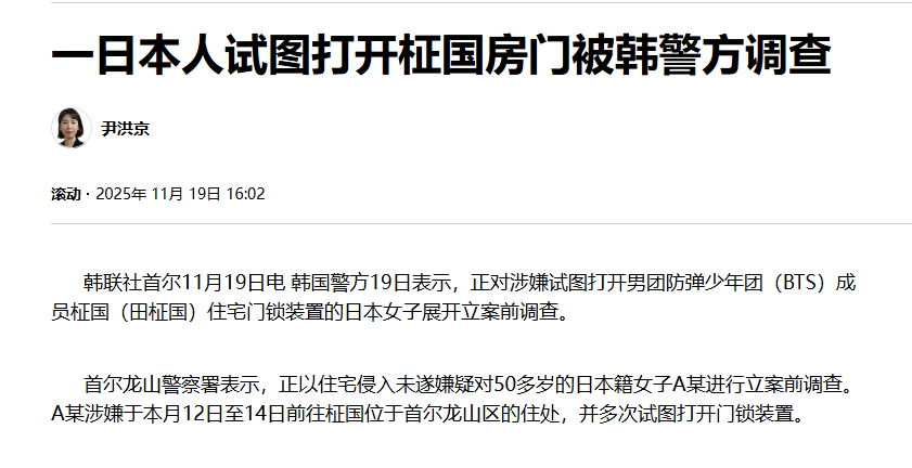 【】 据韩联社报道,韩国警方19日表示,正对涉嫌试图打开男团防弹少年团(BTS)成员柾国(田柾国)住宅门锁装置的日本女子展开立案前调查。首尔龙山警察署表示,正以住宅侵入未遂嫌疑对50多岁的日本籍女子A某进行立案前调查。A某涉嫌于本月12日至14日前往柾国位于首尔龙山区的住处,并多次试图打开门锁装置。在此之前,一名40多岁韩国女子今年8月曾闯入柾国住处的停车场,近期因涉嫌非法侵入住宅罪和违反《跟踪缠扰罪处罚法》被送检。