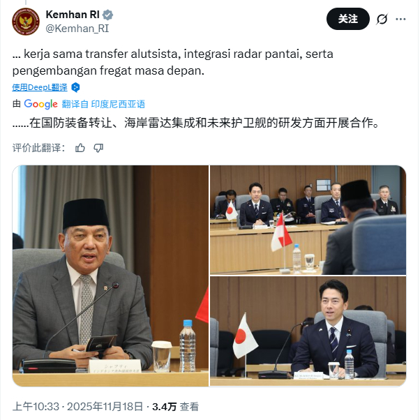 印尼国防部官X提及印尼与霓虹2+2协商时印尼欢迎双方在武器装备转让、岸基警戒雷达系统集成、未来护卫舰开发方面进行合作