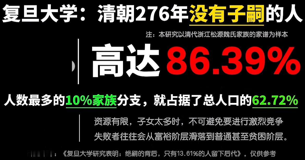穷不过三代的真相恐怕是绝后了… 看到一个帖子, 里面有一组数据,通过对一个家族的研究,清朝整体算下来,大部分人最后没有子嗣! 有些有钱人可能孩子多,但随着时间的推移,竞争的加剧, 很多人无法立于不败之地, 最后逐渐绝嗣。 网上一直有一个说法,说现在我们能够存在,是因为祖上都不算太差,如果太差,早就没后代了, 这份研究好像也确实证实了这一点。 清朝 人口 结婚 后代 生孩子 清朝人口