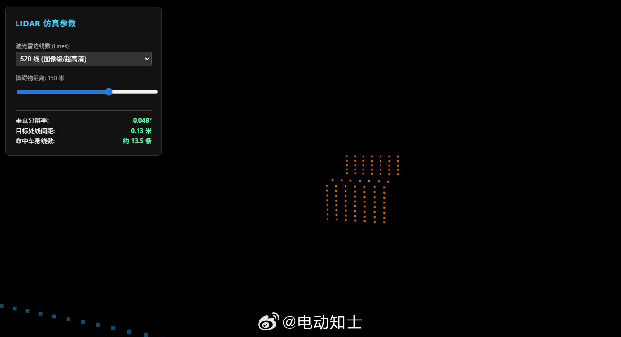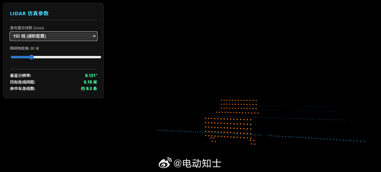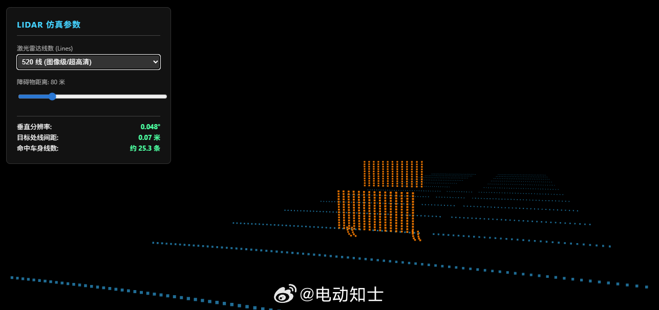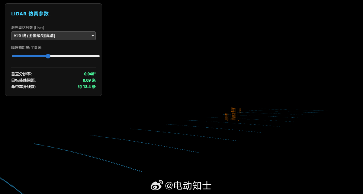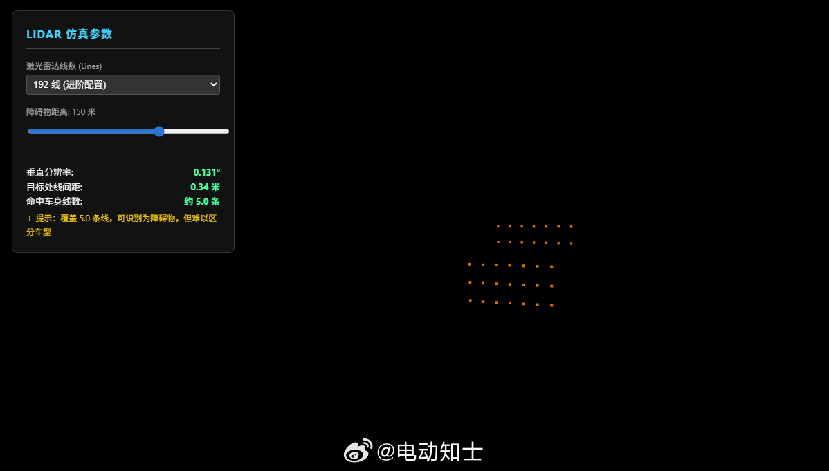 可以看到,模拟的非常专业、直观。左上角可以自己选择参数,包括雷达线数、障碍物距离等等。在下方,还会给出当前模拟下的激光雷达参数,如垂直分辨率、命中车身线数、以及在这个情景下可能的表现等。