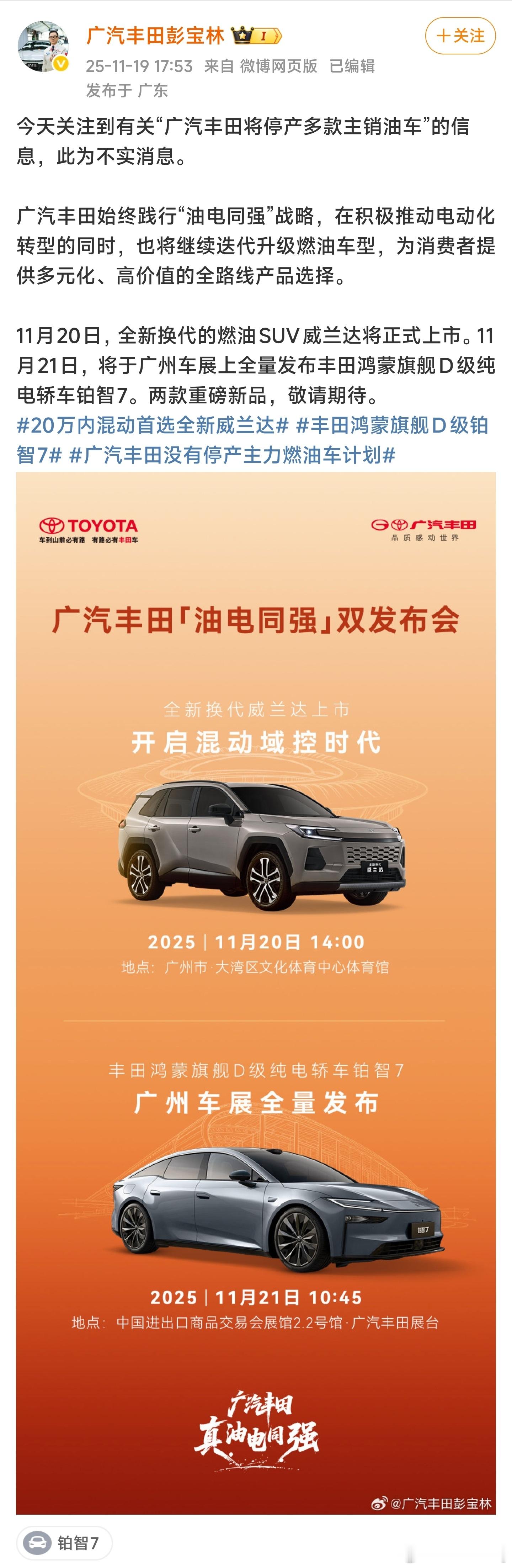 最近有传闻说广汽丰田马上要停产一系列主销燃油车,其实一听到这个消息,我就觉得非常假。且不说油车依然在市场上有不小的占比。广汽丰田一直都在着重强调并且践行油电同强的战略,不仅要发展电动化,同时也要将最新的智能化技术升级到燃油车上。果然,彭宝林就在刚刚出来辟谣,并且宣布他们在明天20日就要发布新一代威兰达,21日还要发布铂智7。威兰达作为广汽丰田的主销SUV,这代不仅升级了第五代智能电混双擎,响应迅速更省油,在智能化配置这块也花了大力气升级,大屏车机,carplay支持,甚至还有HUD可选,让油车也能享受最新的智能化体验。听说这次的新车价格会在20万以内,大家可以期待一下明天公布的最终售价