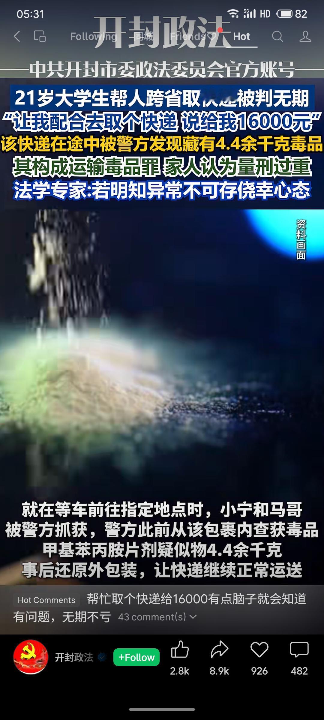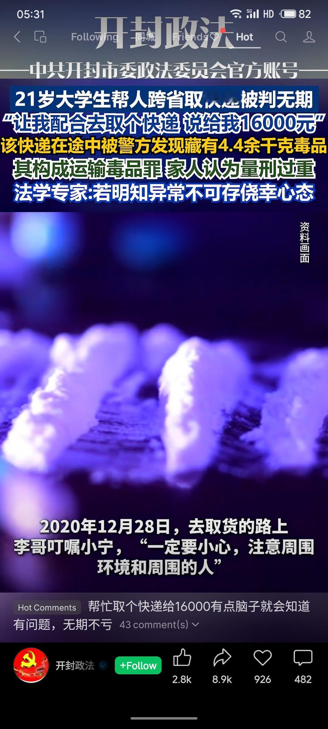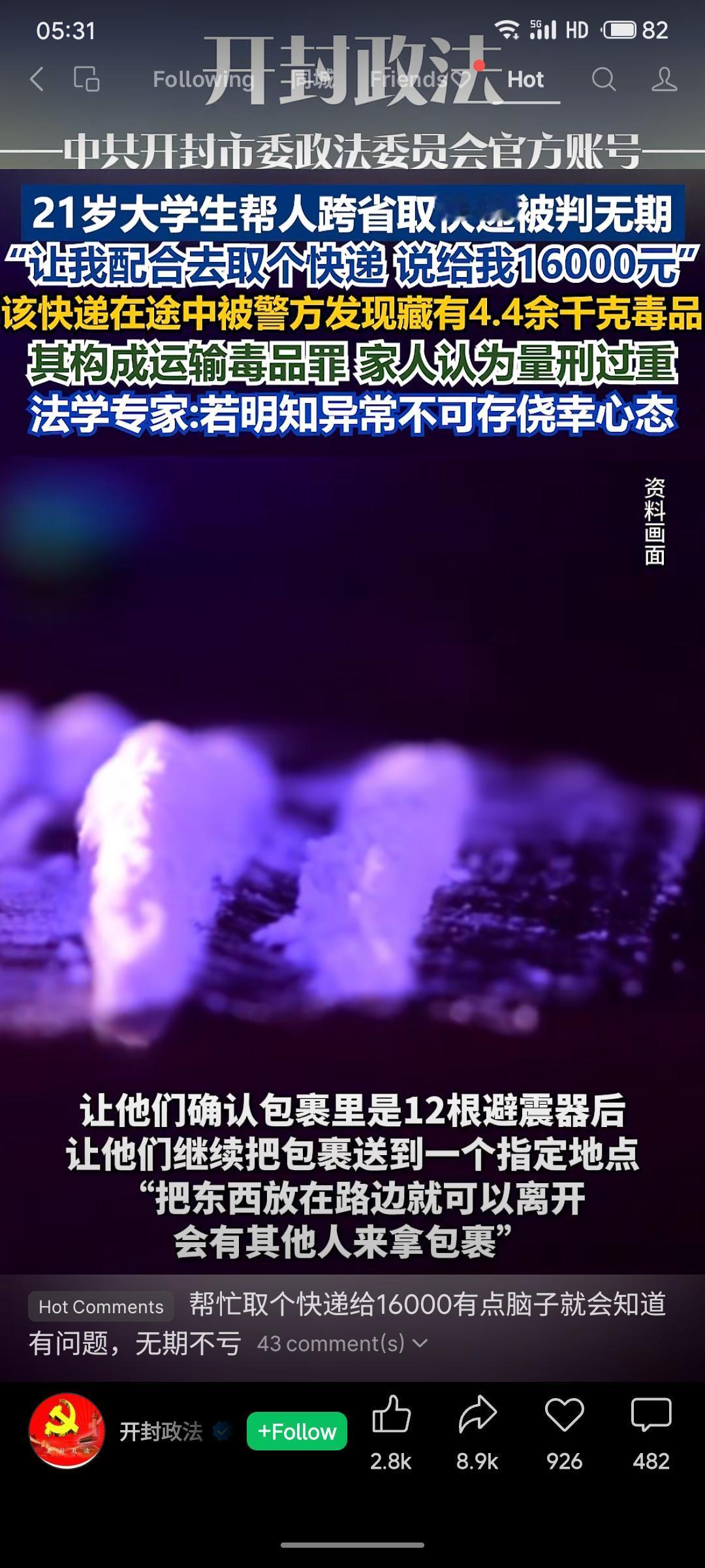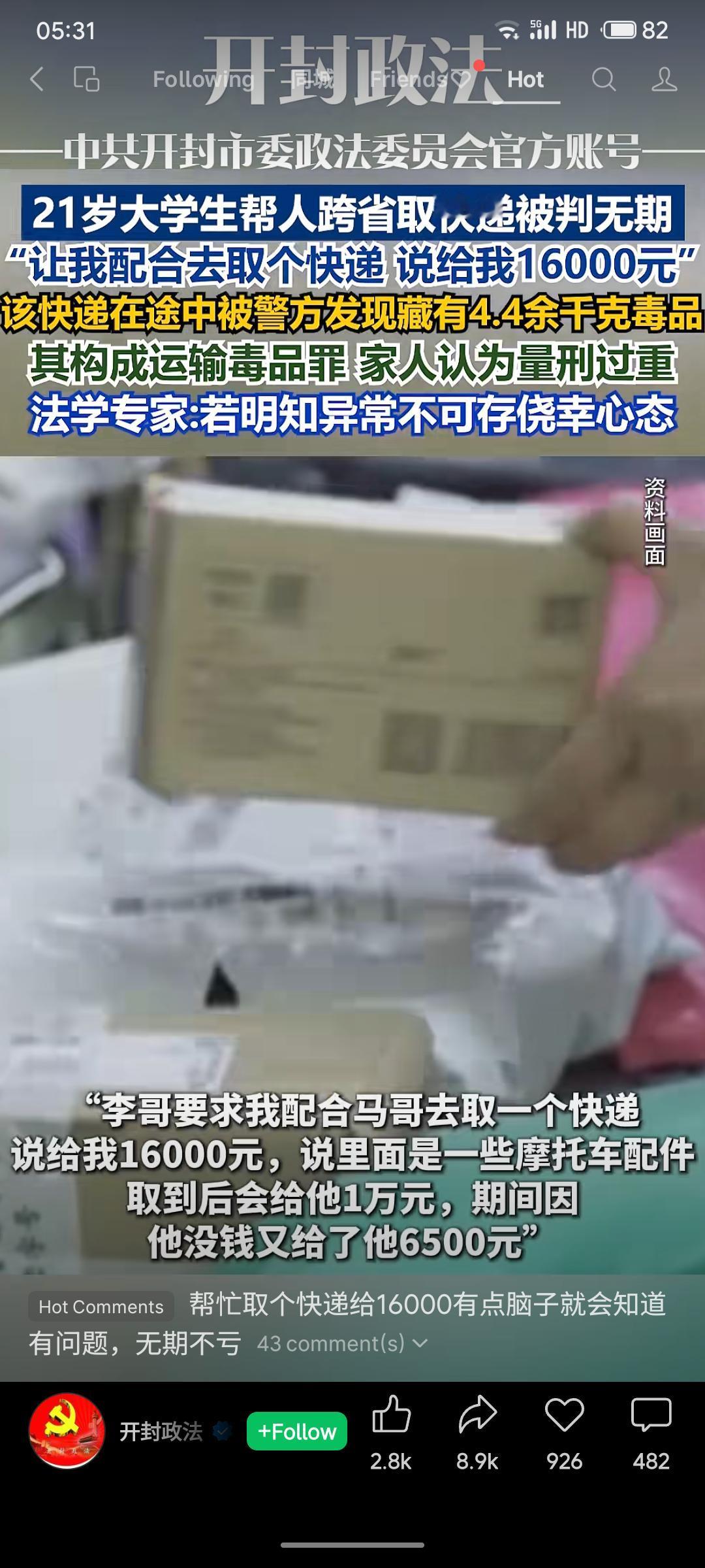 一名21岁大学生受高额报酬(16000元)利诱,帮他人跨省取快递,结果该包裹内被警方查获藏有4.4余千克毒品。其行为构成运输毒品罪,最终被判处无期徒刑。家人认为量刑过重并提出申诉,法学专家则指出,对明显异常的高回报事务不可心存侥幸。