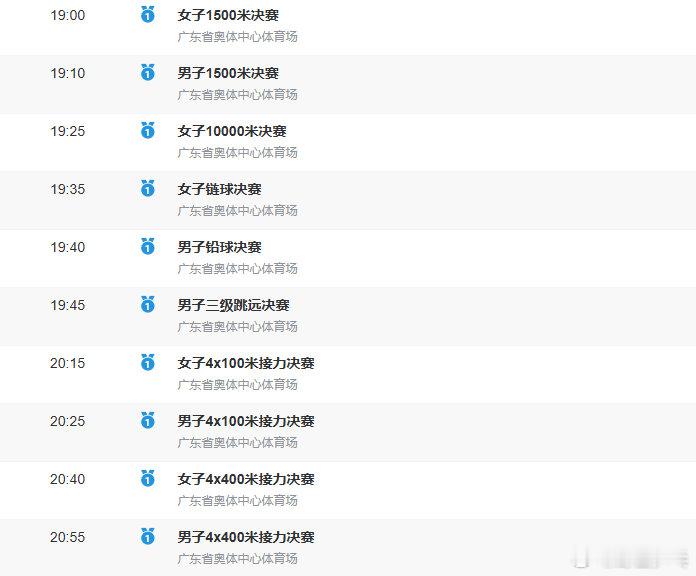 2025全运会田径项目今日收官,将决出最后12枚金牌09:30 男子铁饼决赛09:35 男子10000米决赛19:00 女子1500米决赛19:10 男子1500米决赛19:25 女子10000米决赛19:35 女子链球决赛19:40 男子铅球决赛19:45 男子三级跳远决赛20:15 女子4x100米接力决赛20:25 男子4x100米接力决赛20:40 女子4x400米接力决赛20:55 男子4x400米接力决赛
