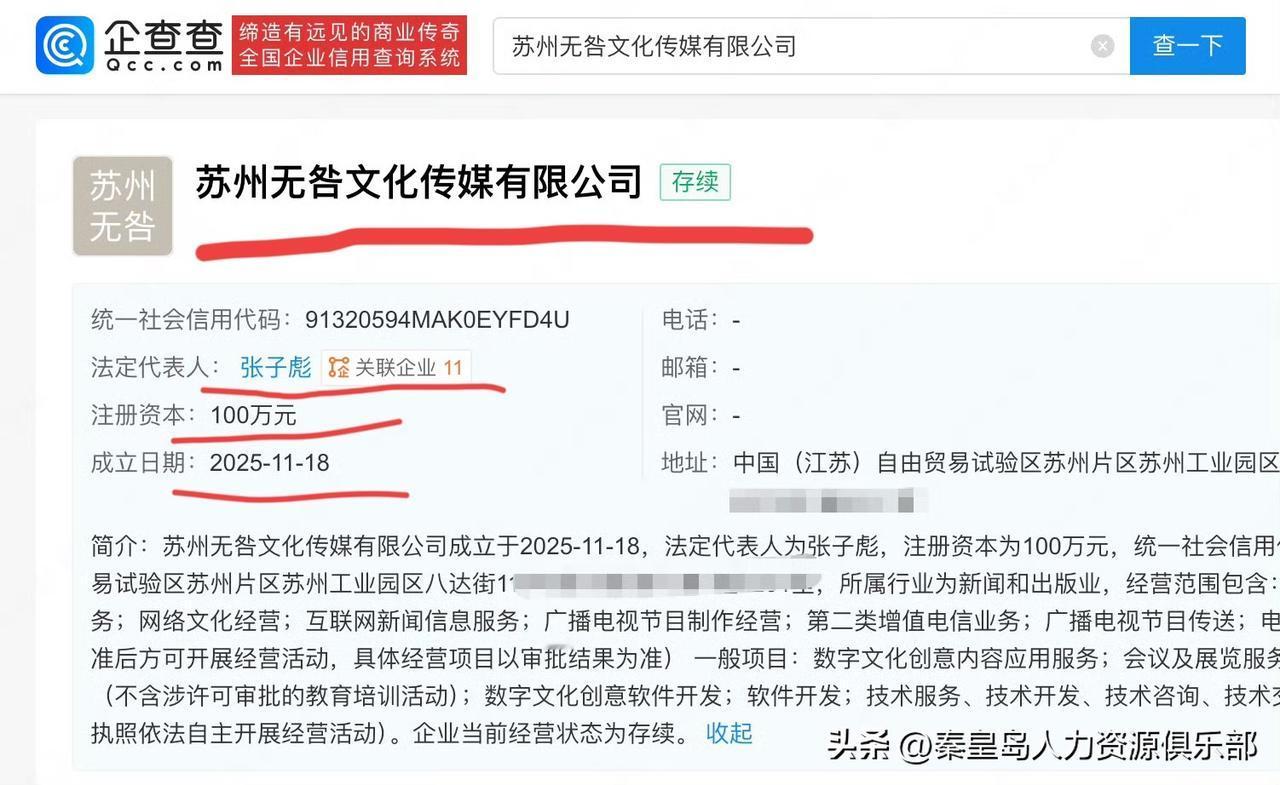 张雪峰新公司开张了!“无咎”这名起得妙,是想说以后怎么折腾都无过错、无灾祸?天眼查显示,他11月18日用本名张子彪注册了“苏州无咎文化传媒”,注册资本100万,搞出版、网络文化这些营生。算上这家,他名下关联公司两位数了,教育、科技、文旅,现在又多了传媒,买卖是越铺越大。 要我说,他这步棋走得机灵。之前他那张嘴惹了多少争议,“文科是服务业”、“新闻学无用”,搞得舆论沸沸扬扬,直播间都曾被整得禁过关注。现在成立文化传媒公司,明面上是搞出版物、做节目,和他那些高价研学、志愿填报业务能串起来,比如自己出教辅、做宣传片更方便了;骨子里,怕是也想分散风险,教育行业监管越来越严,多开个赛道就多留条后路。这和他账上常备足额现金应付危机的做法一脉相承,精得很。 张雪峰深谙“财散人聚”的道理。他给员工搞“上四休三”、发无息购房贷款,年终奖一撒就是几千万,团队自然稳当。一边用高福利稳住大本营,一边自己还化身LP,把钱投进半导体、新能源这些硬科技基金,布局未来。如今新公司用自然人持股,没让老主体掺和,摆明了是要轻装上阵,试水新买卖。 从考研老师到生意人,张雪峰这路子野,但也真是把流量和焦虑的生意吃透了。这“无咎文化传媒”能不能真如其名般顺遂,咱就静观其变吧。