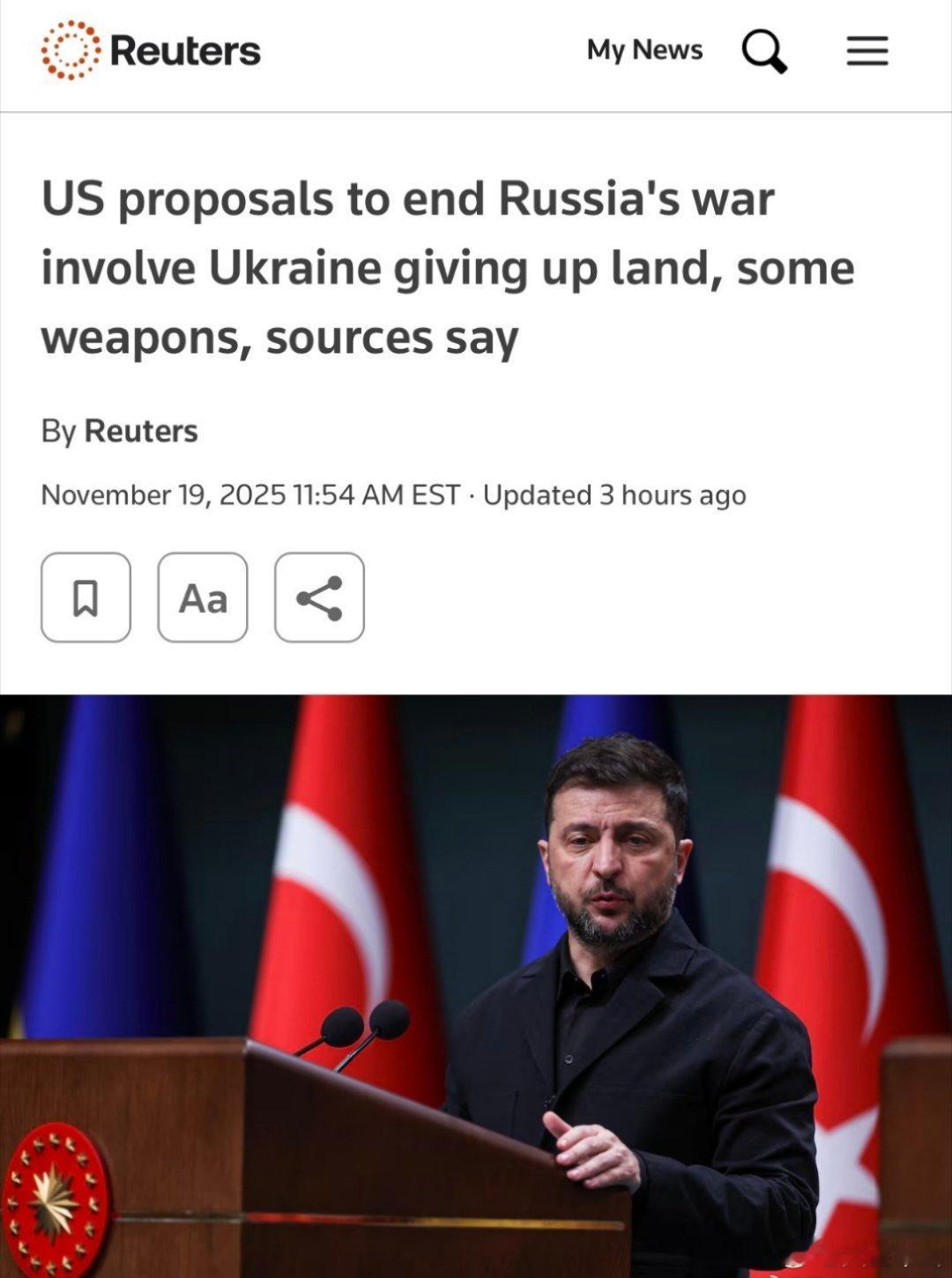 路透社:消息人士透露,美国提出的结束与俄罗斯战争的方案包括乌克兰放弃部分领土和武器。伦敦—两位知情人士周三表示,美国已向泽连斯基发出信号,乌克兰必须接受美国起草的结束与俄罗斯战争的框架协议,该协议提议基辅放弃部分领土和武器。由于事态敏感,这两位消息人士要求匿名。他们表示,除其他事项外,该方案还包括削减乌克兰武装部队的规模。消息人士称,华盛顿希望基辅接受其中的主要内容。