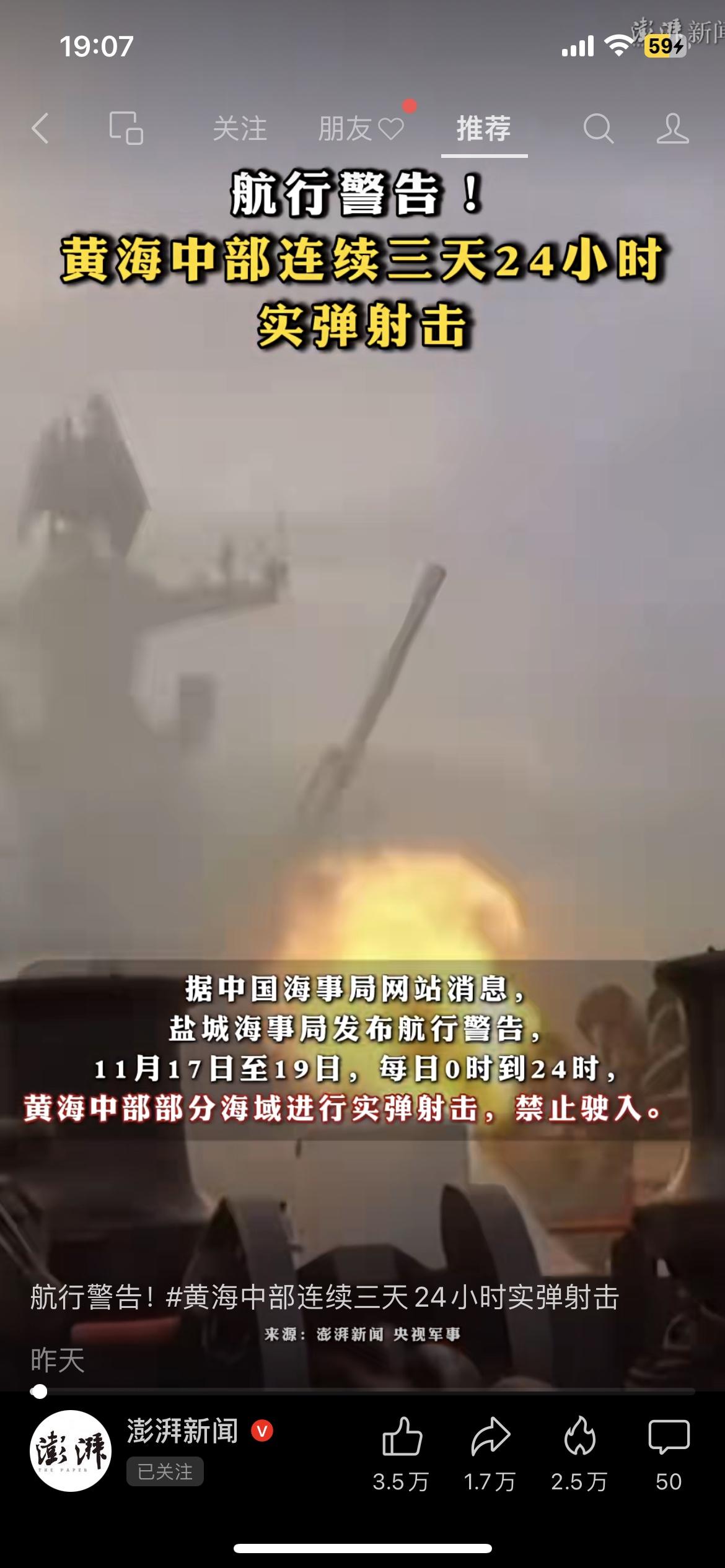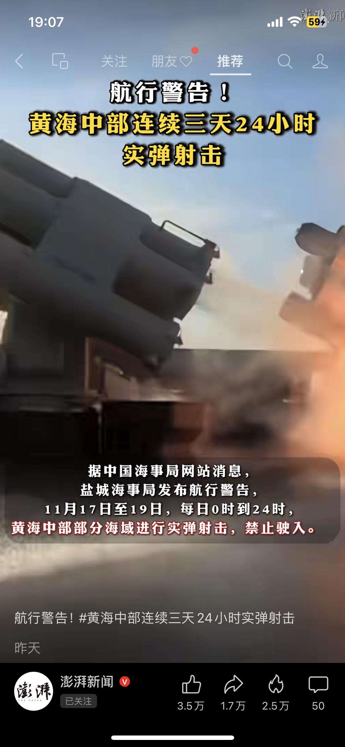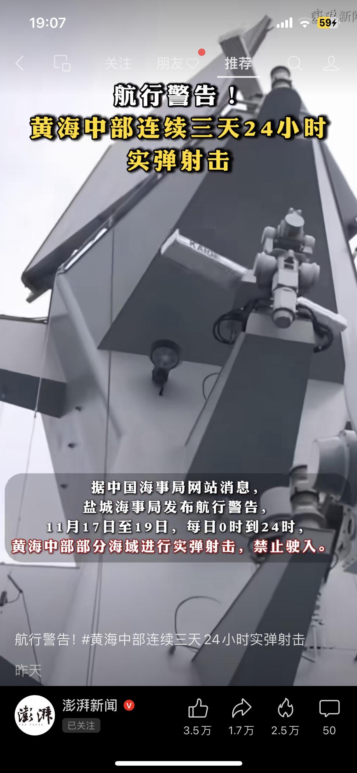 兄弟们注意!黄海这三天别靠近! 刚看到盐城海事局的航行警告:11月17日到19日,每天0点到24点,黄海中部要连续3天24小时搞实弹射击,这片海域直接禁航了! 咱就是说,这阵仗够大的,连续三天全天搞实弹,肯定是重要训练了。有船跑这片航线的朋友,这几天可得绕远路了啊,安全第一! 你们觉得这波训练是练啥的?评论区聊聊~ 黄海实弹射击 航行警告黄海实弹 黄海南部禁航 黄海禁航区