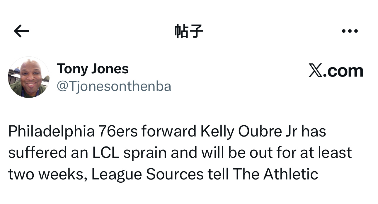 随队记者Tony Jones表示,据联盟消息人士透露,费城76人队前锋凯利·乌布雷遭遇左膝外侧副韧带扭伤,将至少缺席两周!