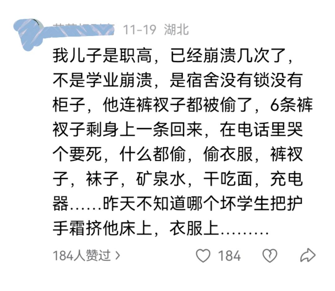 看见一网友的留言,让人震惊不已,颠覆三观。居然偷内裤!知道中职学校管理混乱,学生普遍成绩差,但没想到宿舍里腌臜事这么多,居然有小偷,而且连贴身衣物都偷。 网友说,自己的儿子在中职学校几近崩溃,啥东西都被偷,衣服鞋子袜子,裤衩子,矿泉水,干脆面,充电器,但凡有点用的都给你偷走。6条裤衩只剩身上一条回来。衣服上、床上还被挤护手霜。[捂脸][捂脸][捂脸]我的天,难以想象,这是进了贼窝了吗?这还咋让人安心学习,安全都没有保障了。 必须得给上初中的孩子看看,这要是不好好学习,考不上高中,那就准备进狼窝吧。像他这么单纯善良的,去了只有受欺负的份。不想去就努力学习,考个好高中,让身边都是优秀的人。中职