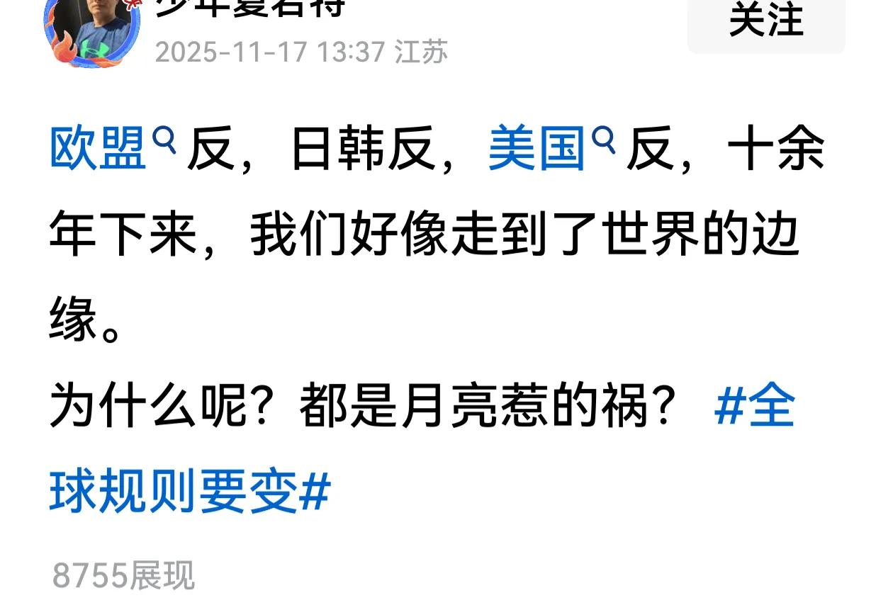 反到哪里去了?反成了相互的最大贸易国?政客反是因为可以搏眼球赚流量,资本可现实的多。肯定的,新秩序要打破旧秩序,肯定会引来旧秩序利益者的反对。美欧日是美元体系的受益者,美国吃肉,他们喝汤,中国是美元体系的掘墓人,怎么可能会跟中国一条心?我们日子一天天变好,他们一成不变,还有的变差了,能不恨我们吗?断人钱财犹如杀人父母啊。