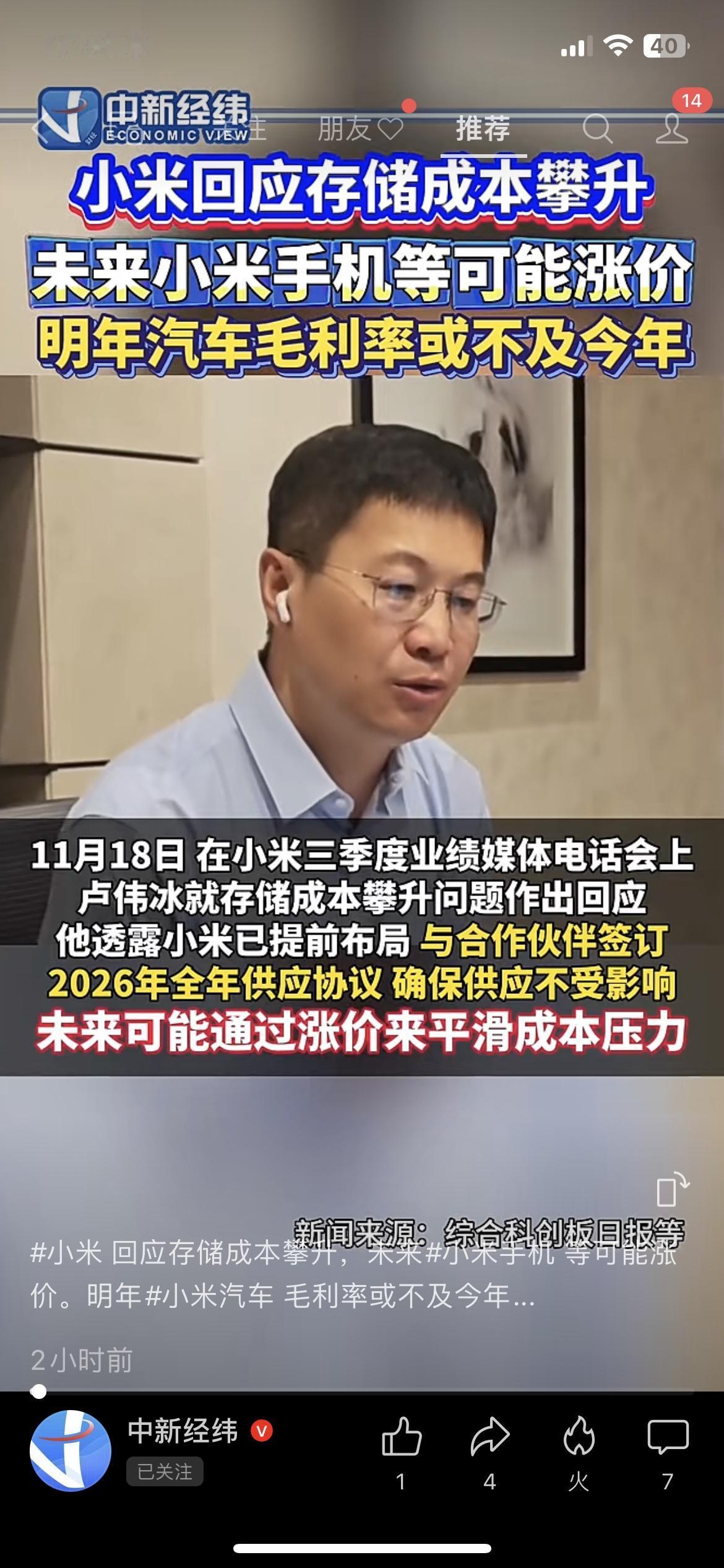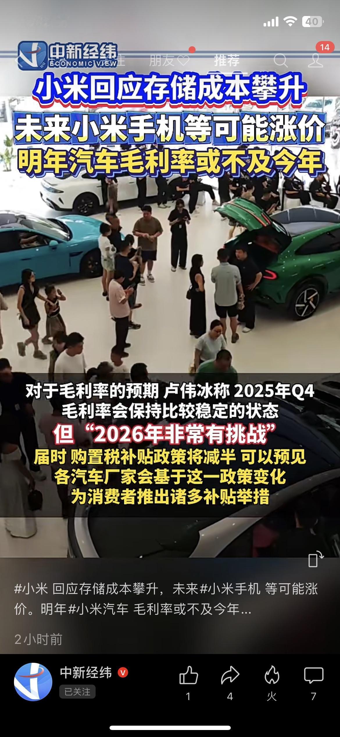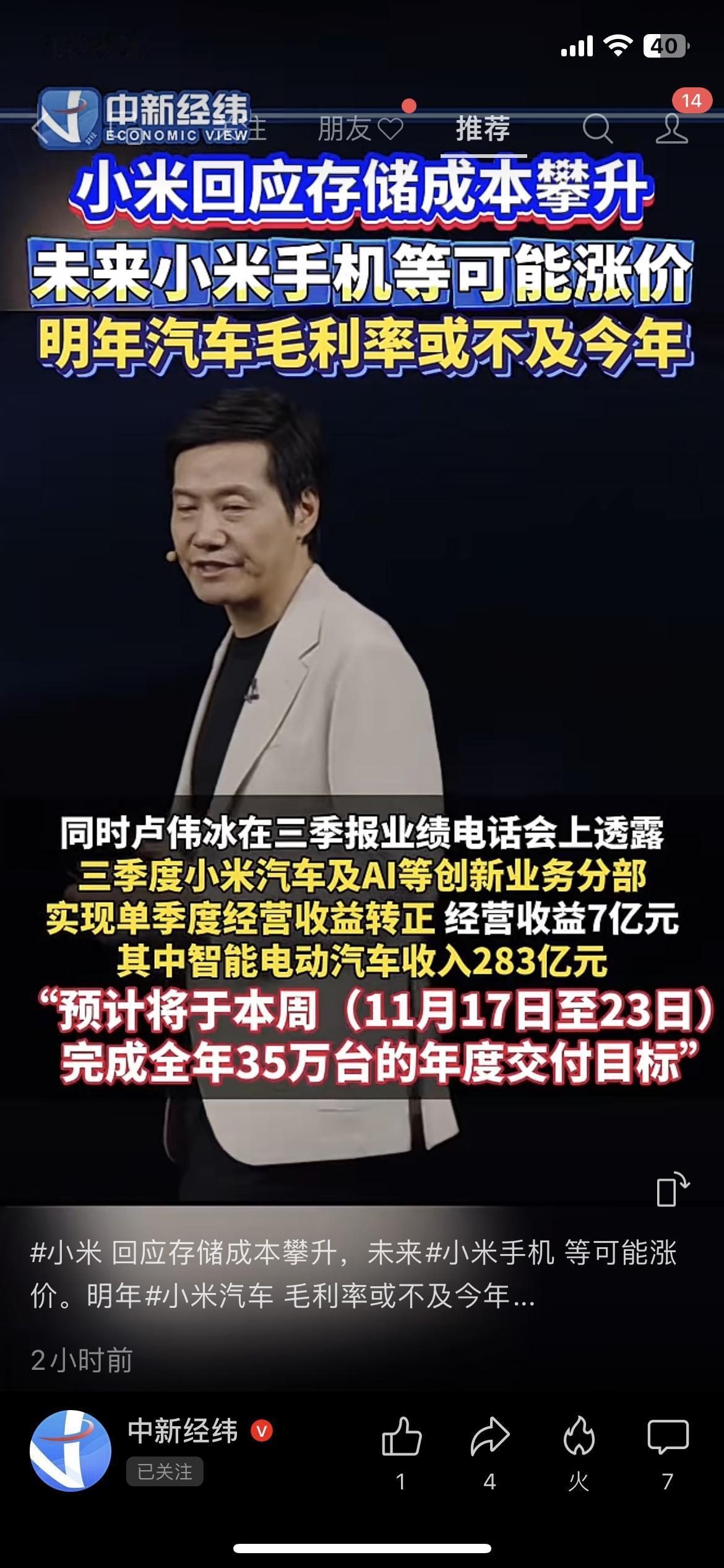 小米刚放2个“矛盾”消息:手机要涨价,汽车明年不赚钱,但车卖爆了? 小米这波操作给我整迷惑了: 前脚说“存储成本涨疯了,手机可能要涨价”——我蹲了俩月的新机,不会要多掏好几百吧? 后脚卢伟冰又说,2026年汽车毛利率“特别难”,明年赚的可能不如今年多… 结果转头甩了个王炸数据:小米汽车这周就能完成35万台全年交付目标,三季度光汽车收入就283亿,还净赚7亿! 合着一边喊“不赚钱”,一边把车卖爆了? 评论区全是吐槽:“手机别涨了,刚把旧机摔了”“车卖这么好,毛利低也能攒现金流啊”。 说实话,小米又搞手机又造车是真卷,但能把新车卖到35万台,是真有本事。就是咱普通用户最慌的:手机到底涨多少?新车会不会跟着涨? 你现在用小米手机不?等不等它的新车?评论区报个到~
