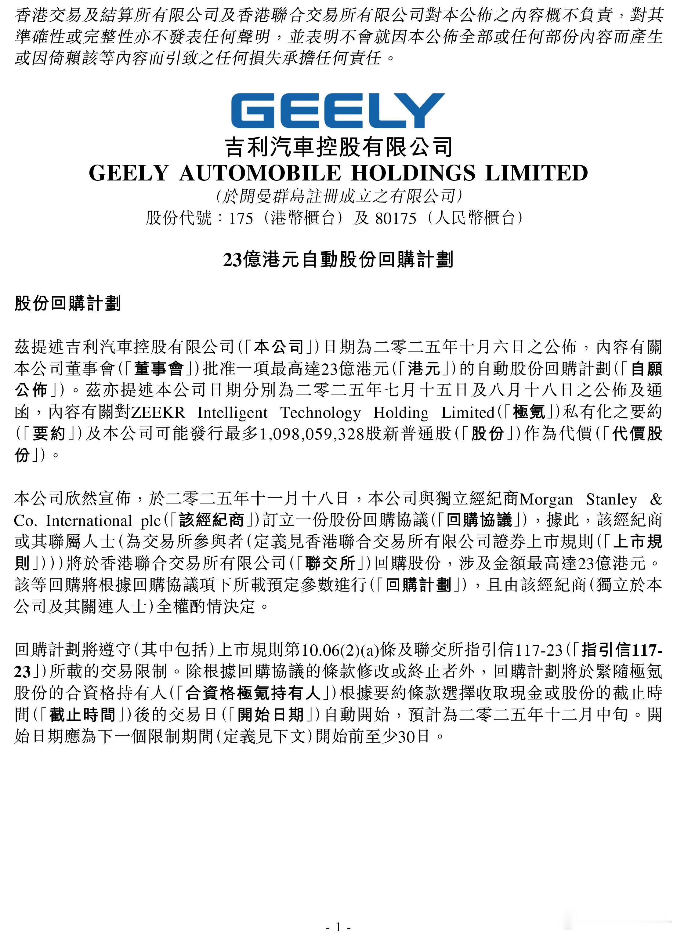 吉利汽车控股有限公司在港交所公告,公司与独立经纪商摩根士丹利Morgan Stanley & Co. International plc订立一份股份回购协议,据此,该经纪商或其联属人士将于香港联交所回购股份,涉及金额最高达23亿港元。计划12月中旬启动、最长持续6个月,回购股份将注销。