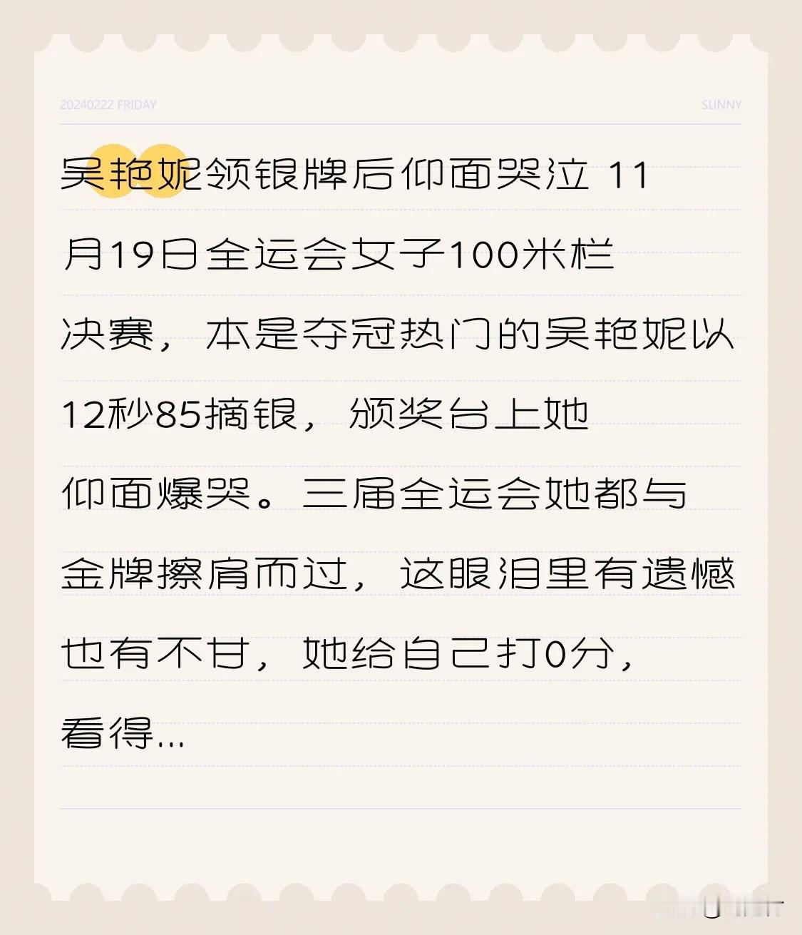 吴艳妮领银牌后仰面哭泣 11月19日全运会女子100米栏决赛,夺冠热门吴艳妮以12秒85摘得银牌。颁奖台上,她仰面哭泣。三届全运会,她都与金牌擦肩而过,这眼泪里满是遗憾与不甘。她给自己打0分,可见其对自己期望之高。 冠军被广东选手刘景扬以12秒81爆冷夺得。有人称她是“黑马”,她却觉得大家实力都强。3个月前全国田径锦标赛,她预赛刷新个人最好成绩,决赛却摔倒未完成比赛。此次她在家门口夺冠,与母亲在看台相拥,画面令人动容。体育赛场充满变数,有遗憾,也有惊喜。 女子百米夺冠 吴艳妮 全运会女子铅球