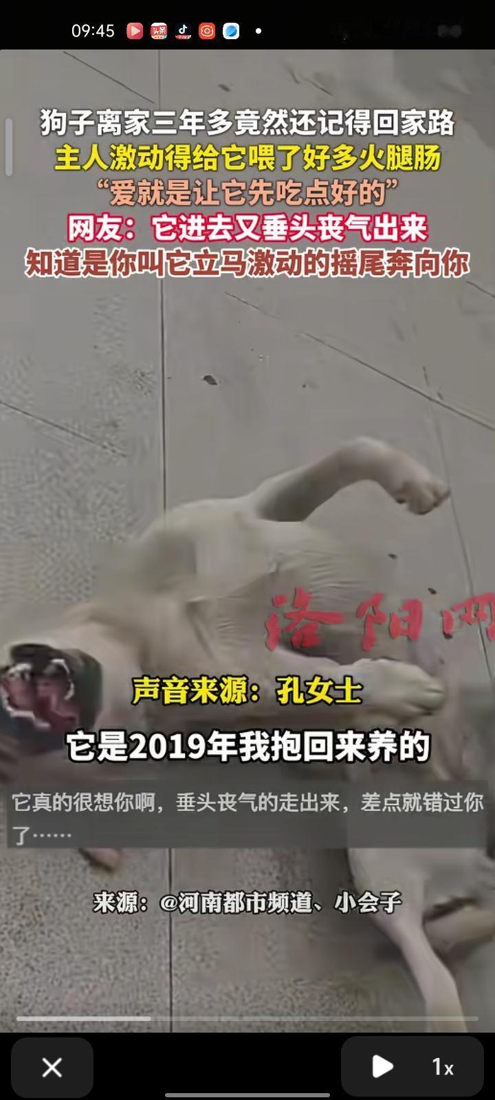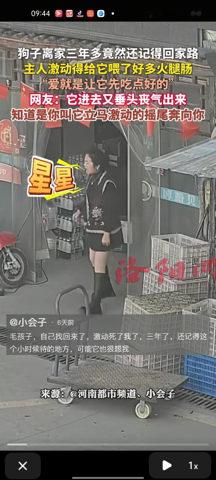 近日,江苏泰州。狗子离家三年多竟记得回家的路,主人激动地给它喂许多火腿肠。主人孔女士介绍,它是2019年时自己抱回来养的,在店里养了两年,在鱼塘里生活了三年多。前段时间走丢了,找了好久都没找到,时隔已经三四年了。当时自己的心里很激动,狗子也很激动,这是中国人爱的表达。
