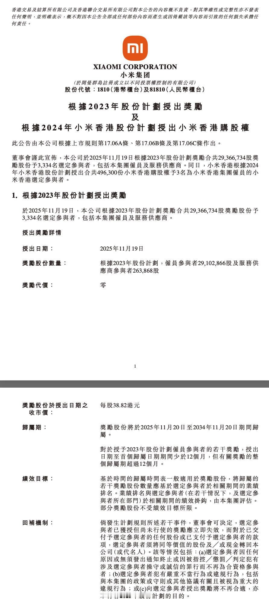 小米向3334人奖励总价值约11.4亿港元股票,人均约34.2万港元 11月19日,小米公司公告,根据2023年股份计划奖励合共29366734奖励股份予3334名选定参与者,包括集团雇员及服务供应商。以每股38.82港元测算,授予股份的总价值约11.4亿港元。