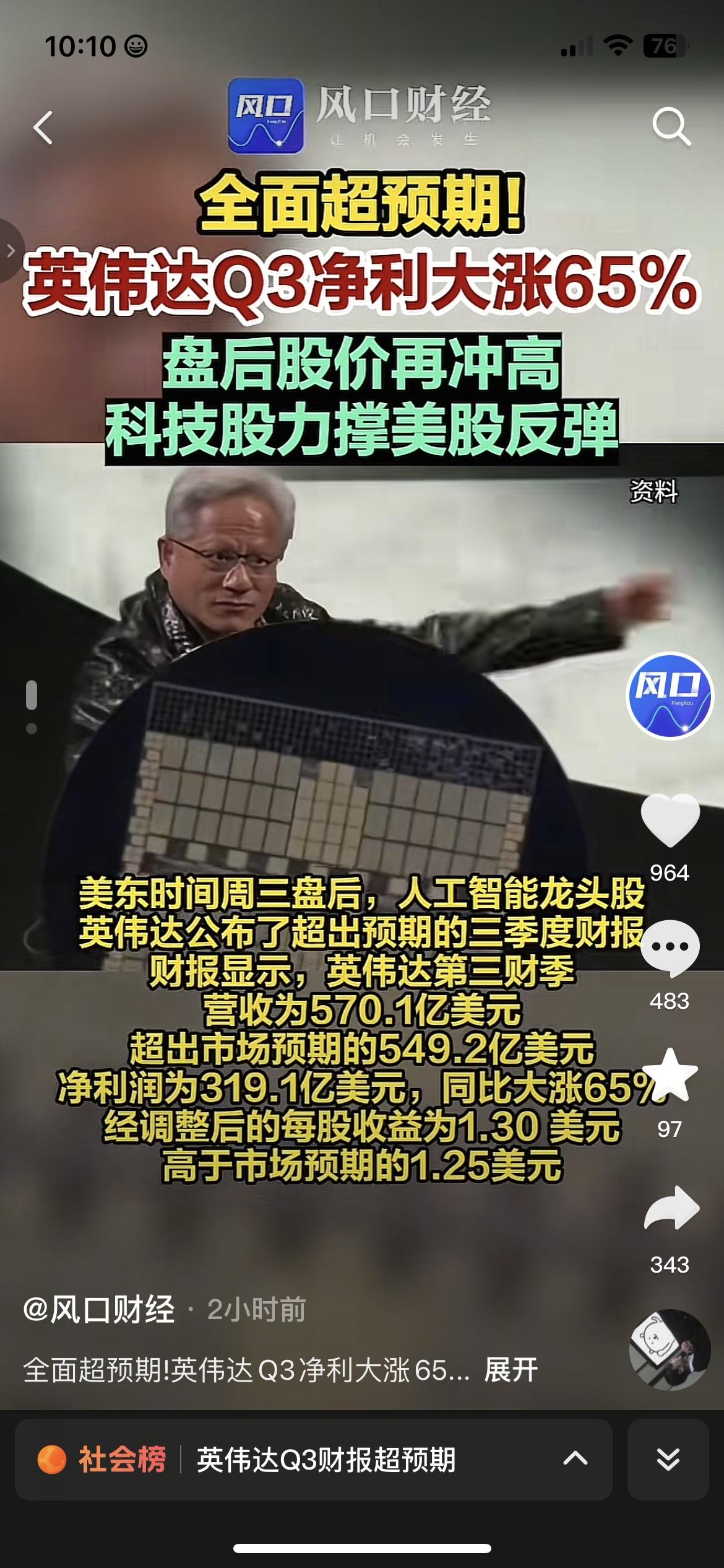 英伟达杀疯了!Q3净利暴涨65%,盘后股价再冲6%,科技股直接带飞美股! 刚看风