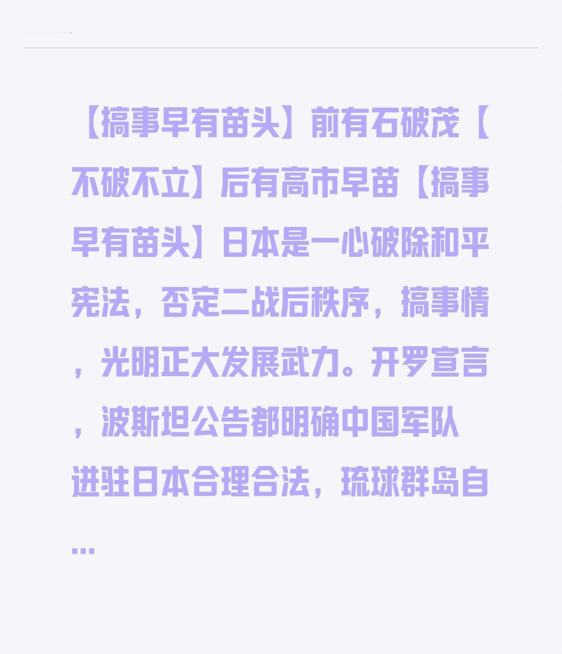 日本【搞事早有苗头】 前有石破茂【不破不立】 后有高市早苗【搞事早有苗头】 日本是一心破除和平宪法,否定二战后秩序,搞事情,光明正大发展武力。 开罗宣言,波斯坦公告都明确中国军队进驻日本合理合法,琉球群岛自古以来都是中国领土。