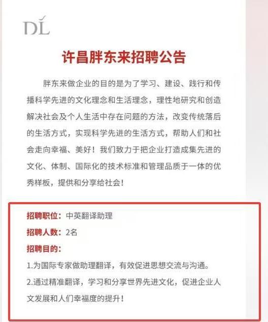 胖东来又上热搜了。这次不是因为服务细节,也不是因为员工福利,而是一个翻译助理岗位