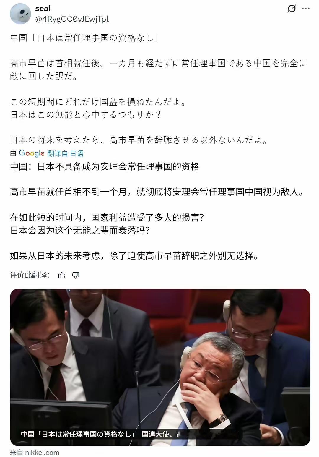 日知名学者内田树批评说:“高市早苗就任首相不到一个月,就彻底将安理会常任理事国中国视为敌人。 在如此短的时间内,国家利益遭受了多大的损害? 日本会因为这个无能之辈而衰落吗? 如果从日本的未来考虑,除了迫使高市早苗辞职之外别无选择。” 这是在我们否决了日本入常之后,内田树如此批评自己的政府。 作为一个二战后成立的国际性组织,五常都是二战的胜利国。而日本作为一个战败国,至今不思悔改。高市早苗更是重走军国路线,敌对中国,妄想修改《自卫队法》,甚至是想拥核。 其上台后,一边“进贡”老美,一边对中国敌意满满,一边重提“存亡危机事态”。历史上,日本提“存亡危机事态”后发动过几次战争,一次日俄战争,一次918事件,一次卢沟桥事变,一次偷袭珍珠港。每一次重提都是一场战役的发生。如今,他们又老调重弹,就这样还想获得中国支持入常?这不是日本太狂妄无知,就是觉得中国人太傻,太天真! 先把自己角色扮演好,为区域和平多做些贡献,再好好地承认侵华战争罪责,不走军国路线,才有资格来谈入常。否则想都别想!