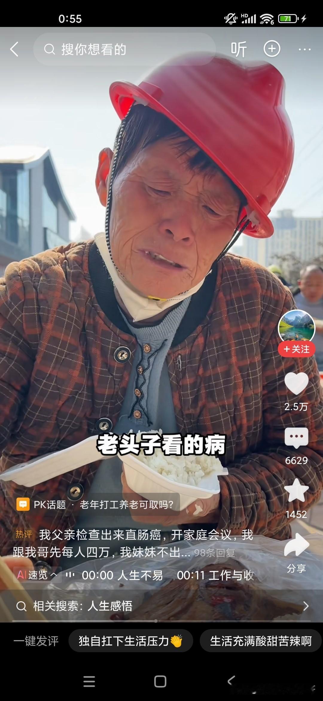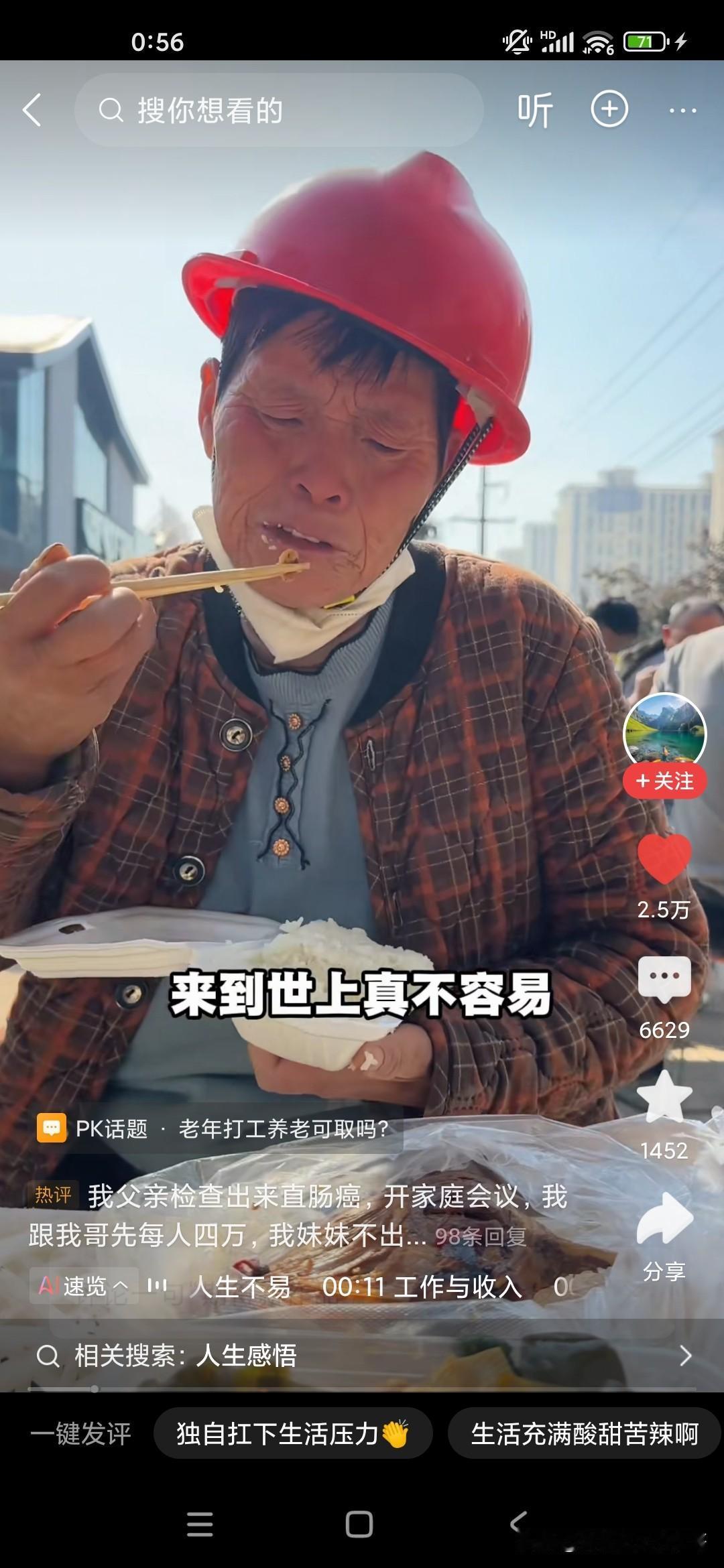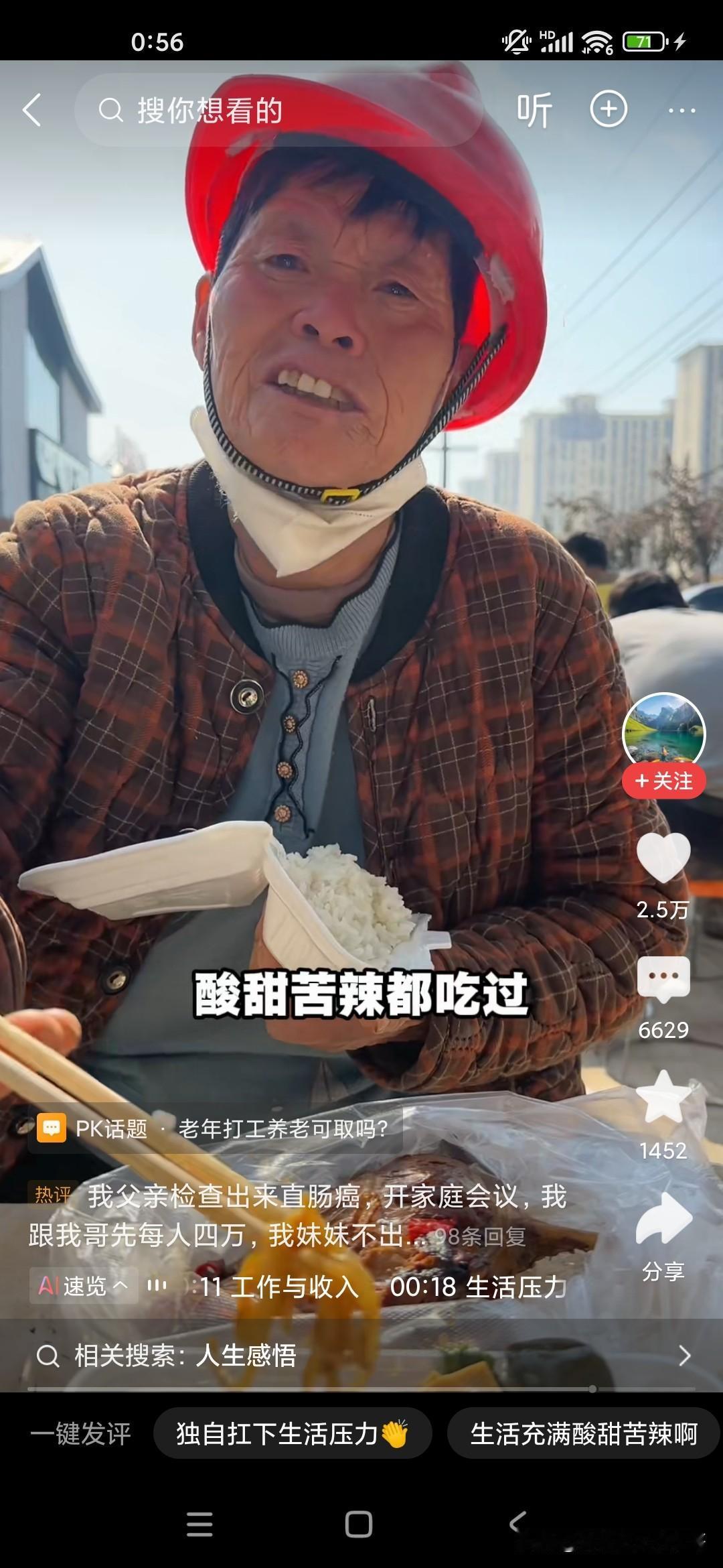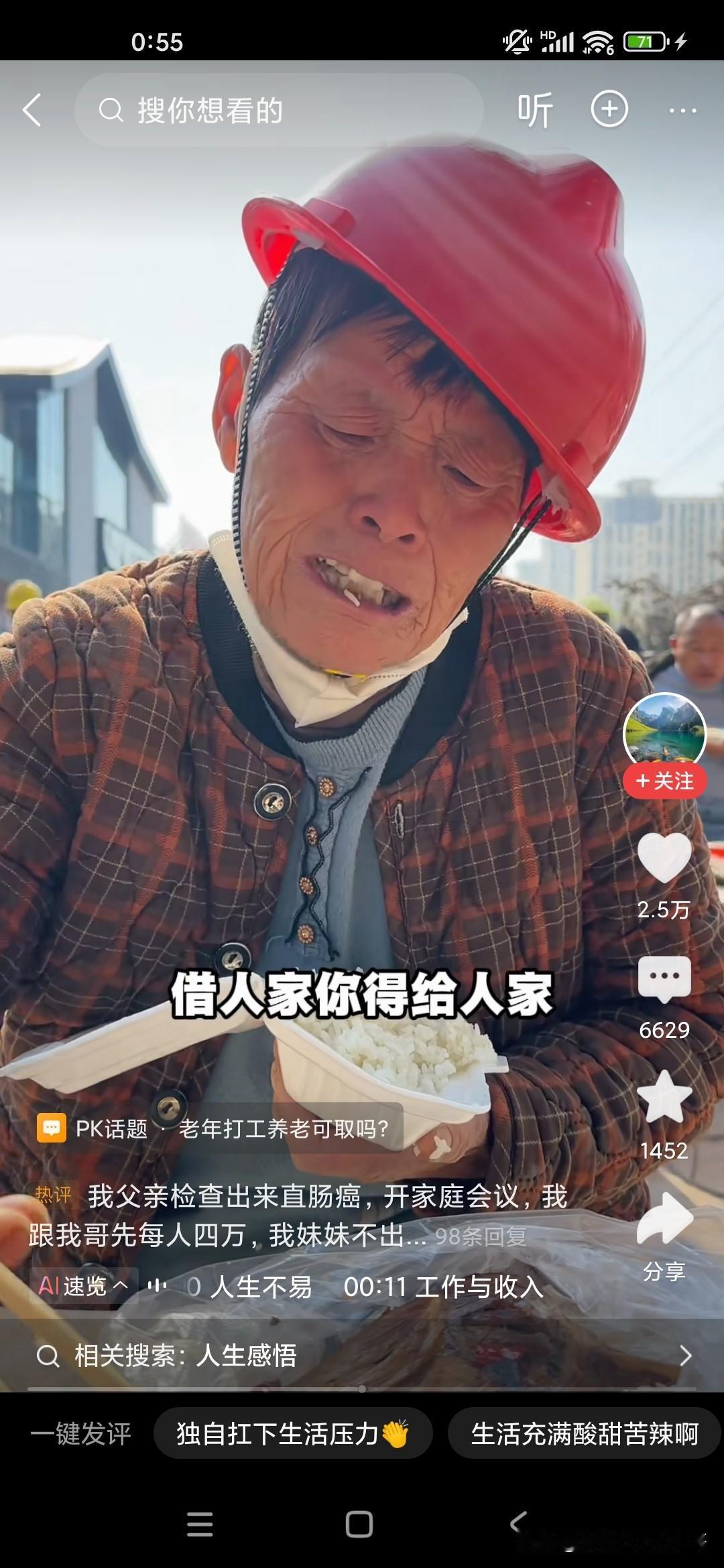 昨天一位记者采访一位打扫卫生的阿姨,这位阿姨已经65岁了,跟我爸妈一样的年纪,仍然在外面打零工,现在的天已经低于10度了,天气非常冷,她自己在外面点的外卖,但是当记者问大姨你没有什么老伴吗?她说老伴已经因病去世了,当时为了给老伴看病,摊了一屁股债,现在已经还了2万了,还有四五万的外债,自己能干一点是一点吧,趁着自己身子骨还行,当时这个记者就问她没有子女吗?她说有5个子女,但是个人有个人的家庭,个人有个人的负担,她不想给自己的儿女添麻烦,当时这个记者眼眶都红了,如果是儿女稍微孝顺一点,帮她母亲稍微分担一点,65岁的母亲也不至于再出来干活呀!有的时候真的是你没有办法理解他们的儿女是怎么想的,我们就抨击他们儿女太不孝顺了,这么冷的天,让65岁的老人出来打工,你们忍心吗?你们有出息吗?你们还是人吗?