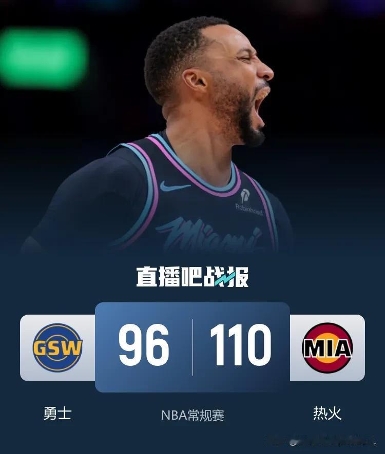勇士的六连客结束,最终战绩3胜3负 热火主场110:96击退残阵勇士,热火队6人得分上双,复出的阿德巴约砍下20分,鲍威尔25分。勇士队这边主力球员全部缺阵,全队今天9名球员出战,替补球员拿到55分,首发里边波杰姆斯基拿到20分,其他球员均未上双,理查德0分,勇士队遭遇了两连败。 恭喜热火队取得本场比赛胜利!迈阿密热火 nba热火队