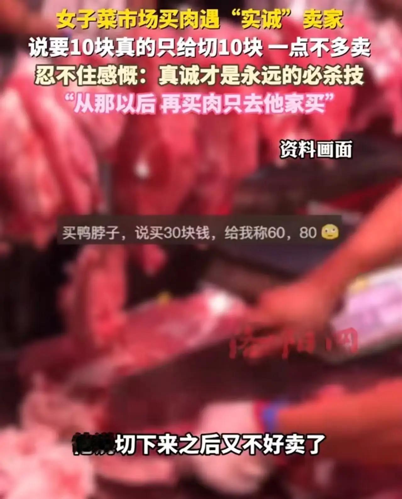 湖南,女子去买肉,提前说好买 10 块,但卖肉的大妈都会给她切 18 块甚至 20 块的肉。女子脸皮薄,大妈又说切下来之后就不好卖了,女子就只能认了!直到女子有一天换了一家卖肉的档口,忍不住感叹:真诚才是永远的必杀技! 之前 女子买肉的摊位是个老大妈,觉得她岁数大不容易,就想着照顾她的生意。 每次去,女子都会明确说只要10块钱的肉,可大妈每次都切多,有时候是十七八块,有时候甚至超过20块。 大妈还会说:“十块钱太少了,不好切,要是再切一截下来,这肉就不好卖了,你把这块都买走,慢慢吃就行。” 刚开始,女子没太在意,可次数多了,她心里就开始犯嘀咕,觉得这样不太舒服。 有一天,肉档里来了一对年轻的卖肉夫妻。女子心想,要不换这家试试看。 于是,她对年轻的男肉贩说:“给我来10块钱的肉。” 那年轻的男肉贩笑着点点头,动作熟练地拿起刀,轻快地切了一块肉,放在电子秤上称重。显示屏上跳出了“12块”的数字。女子心里一动,觉得多了两块钱,虽然有点不舒服,但也还能接受。 她掏出手机准备付钱,正要掏钱包时,男肉贩却突然拿起刀,又开始在那块肉上割了几刀。“你不是说只要10块吗?”他笑着问。 女子一愣,惊讶地看着他:“你还要再切?不是说只要10块吗?” 男肉贩依然笑着:“是啊,10块钱的肉,称出来是12块,那我就帮你割掉两块,刚好是你要的10块。这样你吃得放心,也不会觉得多了。” 这简单的一幕,让女子顿时明白了什么。“真诚”,其实就藏在这份细节里——那份对顾客的尊重与坦诚。 从那天起,女子再也没有去那位大妈的摊位。她开始习惯去这对年轻夫妻的档口。她发现,虽然偶尔还会多出几块肉,但他们从不偷偷少割,也从不“算计”顾客。每次买肉,都是一份坦荡和信任。 更令人震惊的是,随着时间推移,那对年轻夫妻的生意越做越红火。排队的人络绎不绝,顾客们愿意多等一会儿,只为买到那份“真诚的味道”。而那位大妈的摊位,逐渐变得冷清,顾客寥寥。 这故事,折射出一个永恒的真理:在这个浮躁、功利的社会,真正能打动人心的,永远是那份“真诚”。无论是买卖、工作,还是人际关系,短暂的算计可能带来一时的利益,但长远来看,只有用心、用真诚去对待每一个人,才能赢得真正的信任和尊重。 有人说:“这只是一块肉的故事,有必要这么深吗?”但我想告诉你,这背后隐藏的,是人性最本真的一面。我们都渴望被真诚对待,也都希望身边的人能用心去感受我们的存在。 在这个充满诱惑和利益的时代,或许我们都应该学会像那对年轻夫妻一样,用一份真诚去打动人心。因为,真诚才是永远的“必杀技”,它能让你在纷繁复杂的世界里,赢得最纯粹的信任和温暖。 所以,下次面对生活中的“多一块少一块”的抉择时,记住:用心、用诚意,或许会让你的人生变得更温暖、更有力量。头号周刊 挑选肉