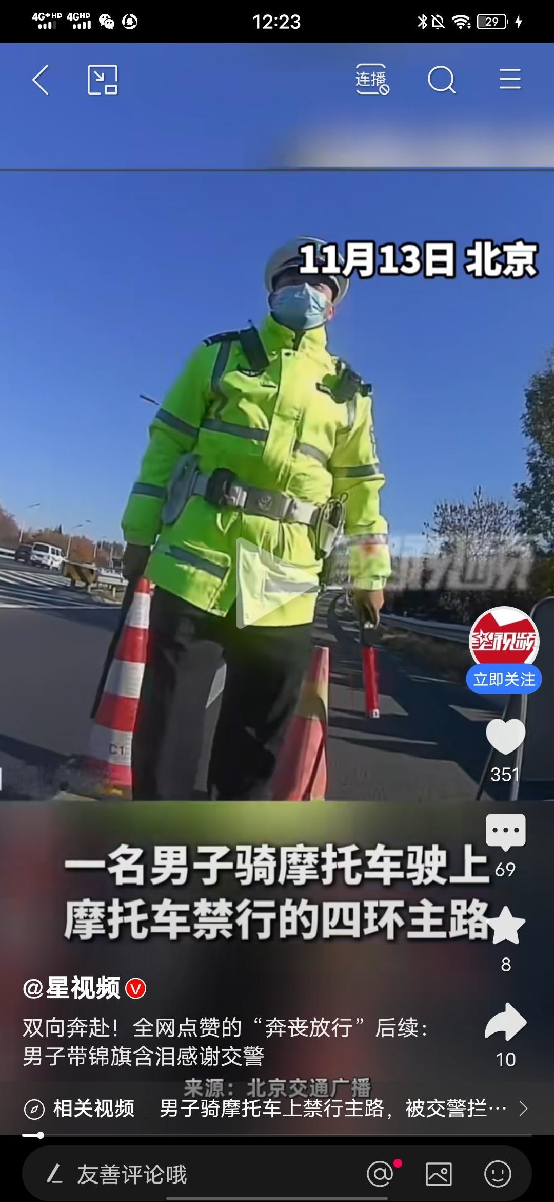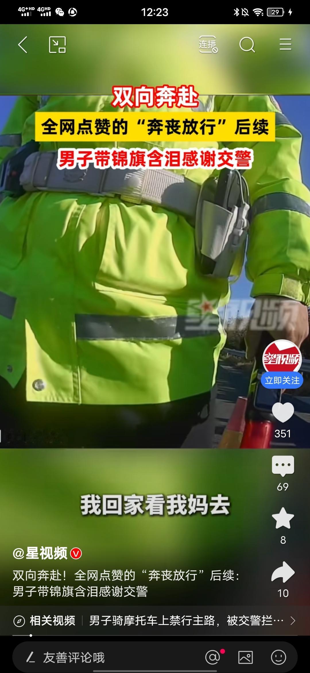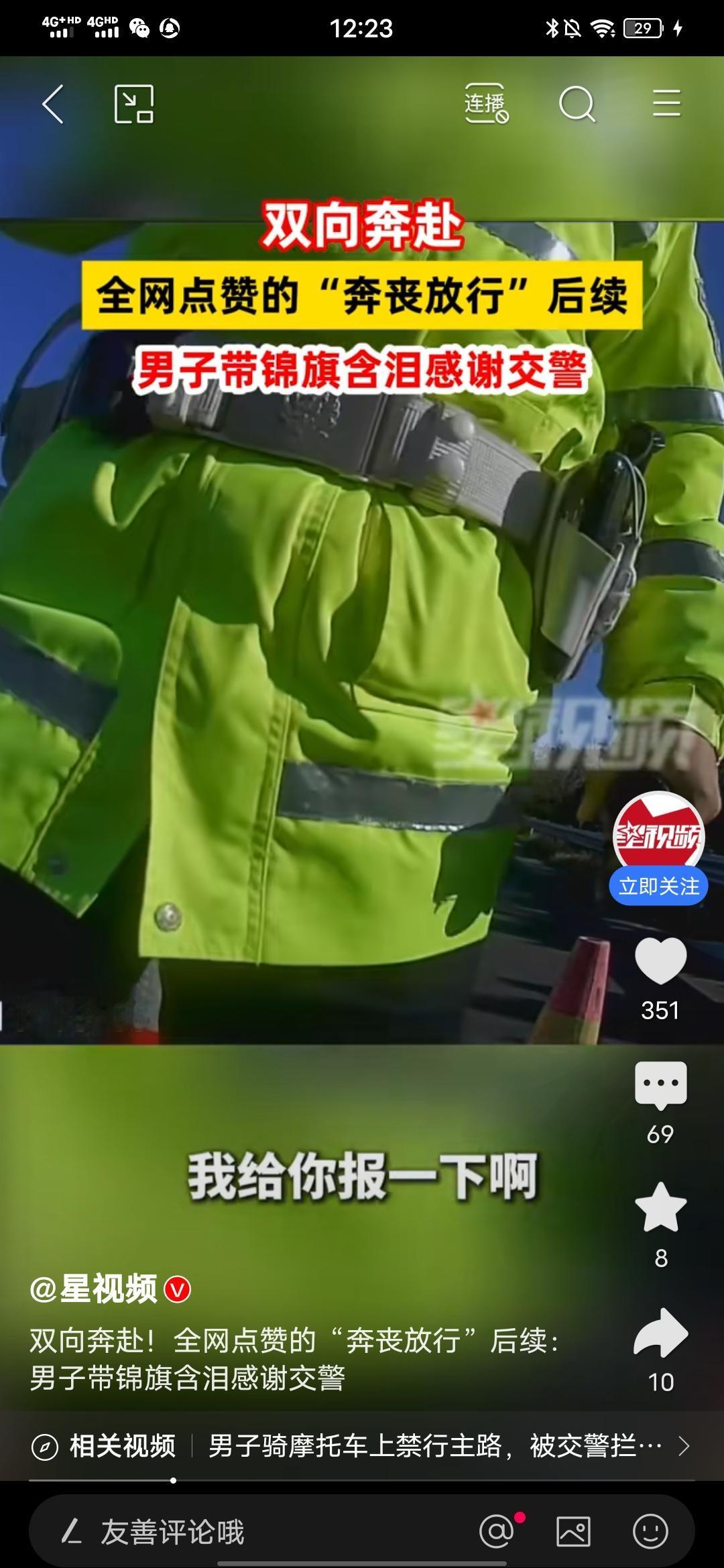 双向奔赴!全网点赞的“奔丧放行”后续:男子带锦旗含泪感谢交警。 看到相关媒体平台发布的报道,我前段时间仿佛是看到过这样一个事件,昨天这位男子宋磊去到朝阳交通支队给当时给他放行的金彤警官和高速度大队送锦旗。 事情是这样的,当时宋磊骑摩托车违规超车,交警金彤当时以为他要闯卡,就拦截下来了,一问他怎么回事,宋磊就哭了,他说他妈没了,他要赶回去看妈妈,金彤见状于心不忍,便问他走哪天路线,便给他上报放行了。 过去一段时间了,他料理完一切事物,就去送锦旗了。很多网友都为他们点赞,确实呢,这才是执法者在工作中应该体现出来的人性共情,法当然威严,但在特殊的情况下,应该通融,人都一样,只是身份与职业不同而已。 称是有温度的执法。确实,为双向奔赴的警民温暖情点赞!