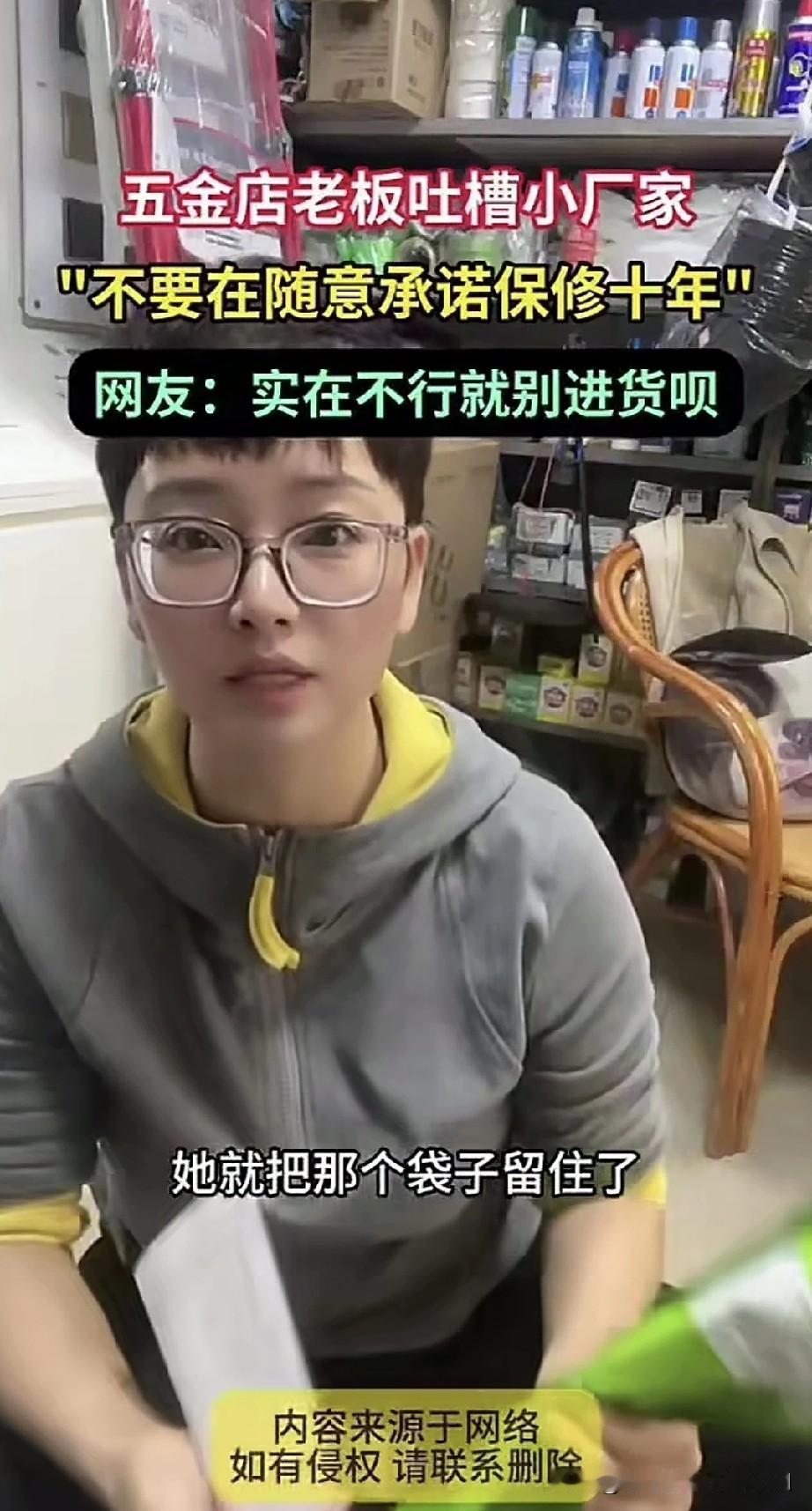 五金店老板娘吐槽,五金件厂家别在包装袋上随意承诺保质期10年只换不修。你们厂家说不定都倒闭了,我还在开店,这不得赔死我。 今早来了位阿姨,拿着一根软连接管找老板娘换新。阿姨还留着当时购买软管的发票,是16年12月买的,至今约9年了。就因为包装袋上写着保质期10年只换不修,阿姨就拿着包装袋找老板娘换新。老板娘本不想给换,可阿姨较起真来,非要换新不可。老板娘也没跟她吵,就给换了根新软管。我发视频恳请这些小厂家,别在包装袋上承诺保质期10年了,根本保不了这么久。一根软管才卖7块钱,保10年,这不是开玩笑嘛! 给阿姨换完新软管,她要求我再开个单子,从25年起再保10年。我这脾气一下就上来了,照这样保下去,我死了这软管都用不坏,哪有这种事? 给她换了一根,她还想从25年开始再保修10年,太会占便宜了。换的配件本就不应重新计算保修时间,还是按原来的来。 不得不说,阿姨记性真好,换做我,过个一两年估计都记不清单子和包装袋放哪儿了,连保修10年这事儿都能忘。 阿姨有错吗?东西是你卖的,卖的时候又没说不是保修10年,人家就是冲着这才买的! 说实话,这管子用了9年,质量已经很不错了。但这种虚假宣传确实不妥。如今很多人都缺乏契约精神,诚信方面存在问题。