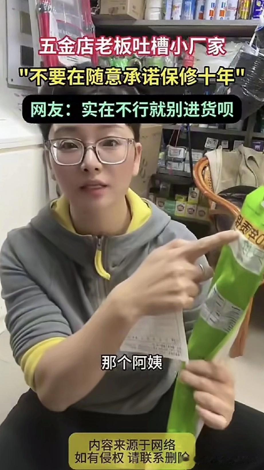 五金店老板娘吐槽,五金件厂家别在包装袋上随意承诺保质期10年只换不修。你们厂家说