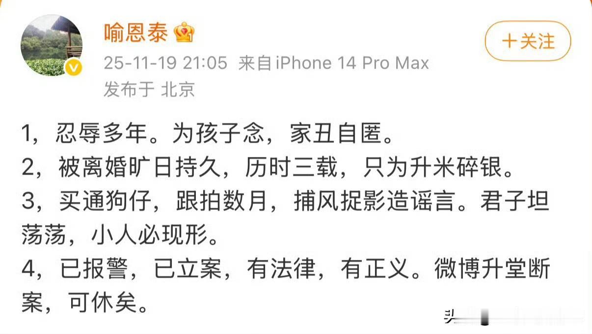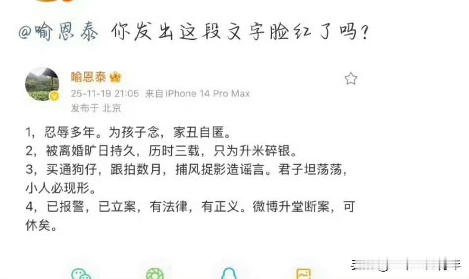 喻恩泰与史林子的离婚事件在短短3天内历经五次次大反转,剧情比影视剧还狗血,具体梳理如下: 首轮爆料:喻恩泰被指“抛妻弃子+转移财产” 11月17日,卓伟爆出猛料,称喻恩泰与史林子已分居两三年,离婚诉讼已开二次庭。 爆料指控喻恩泰拉黑史林子、停付生活费和抚养费,致使她带俩孩子从高档公寓搬入老破小;还私自转移了存放在女方老家、估值约500万的300多箱茅台酒,且近两年几乎不回家看孩子,缺席二次庭审,瞬间被贴上“渣男”标签。 首次反转:好友爆料史林子婚内多次出轨 11月18日,自称双方共同好友的博主“沉稳的石头爱摄影”发文反击。 他称喻恩泰的冷漠是因史林子婚内出轨,2015年她孕期就与旧情人暧昧,2022年起和游泳教练长期保持不正当关系,还组建“反查岗小组”让闺蜜打掩护。 不过其爆料的出轨证据照片,被涉事健身博主辟谣是盗图,使得爆料可信度大幅下降。 同日喻恩泰工作室发声明,否认拖欠抚养费和拉黑妻子,却对史林子出轨传闻模糊回应。 二次反转:喻恩泰被拍与已婚女律师亲密同回酒店 11月19日,八卦媒体放出视频,喻恩泰拍戏期间专程驱车见北京德恒(宁波)律师事务所的张敏进,两人饭后亲密挽手回酒店。 更戏剧性的是,张敏进已婚,其丈夫同为该律所合伙人,目前正因妻子出轨喻恩泰起诉离婚。 这一爆料让事件彻底变成“双方疑似双双婚内出轨”的罗生门,截至目前,双方均未对这一最新指控作出直接回应。 第三次反转:喻恩泰微博亲自下场回应,文言文文绉绉的回应,大概意思就是“妻子确实出轨了,为了孩子隐忍,被离婚 因为财产一直拖到现在,对方买通狗仔偷拍他捕风捉影造谣他出轨律师,他报警了”,看起来是反转了,很有理。 第四次反转:狗仔硬刚喻恩泰,在微博直接评论喻恩泰的发声“你发这些文字脸红了吗”,意思还是喻恩泰撒谎,不承认出轨。 同一时间,著名制作人巨春雷在自己的朋友圈公开发声,说喻恩泰的发声恶心到极致,他老婆已经给他留了体面,他自己不管孩子不看孩子,栽赃泼脏水…” 本以为只是普通出轨,没想到妻子史林子也被朋友曝出婚内出轨,两人分居都三年了。 好家伙,这不是“双出轨”现场吗? 难怪网友调侃“武林外传”变“武林外遇”了! 喻恩泰在戏里演老实人,现实中婚姻却这么狗血,分居三年还装没事人,这操作真让人看不懂。 你说这俩人,一个找律师,一个被朋友捅破,到底是谁先对不起谁? 这真是人生如戏,戏如人生,现在离婚官司打着,猛料一个接一个。