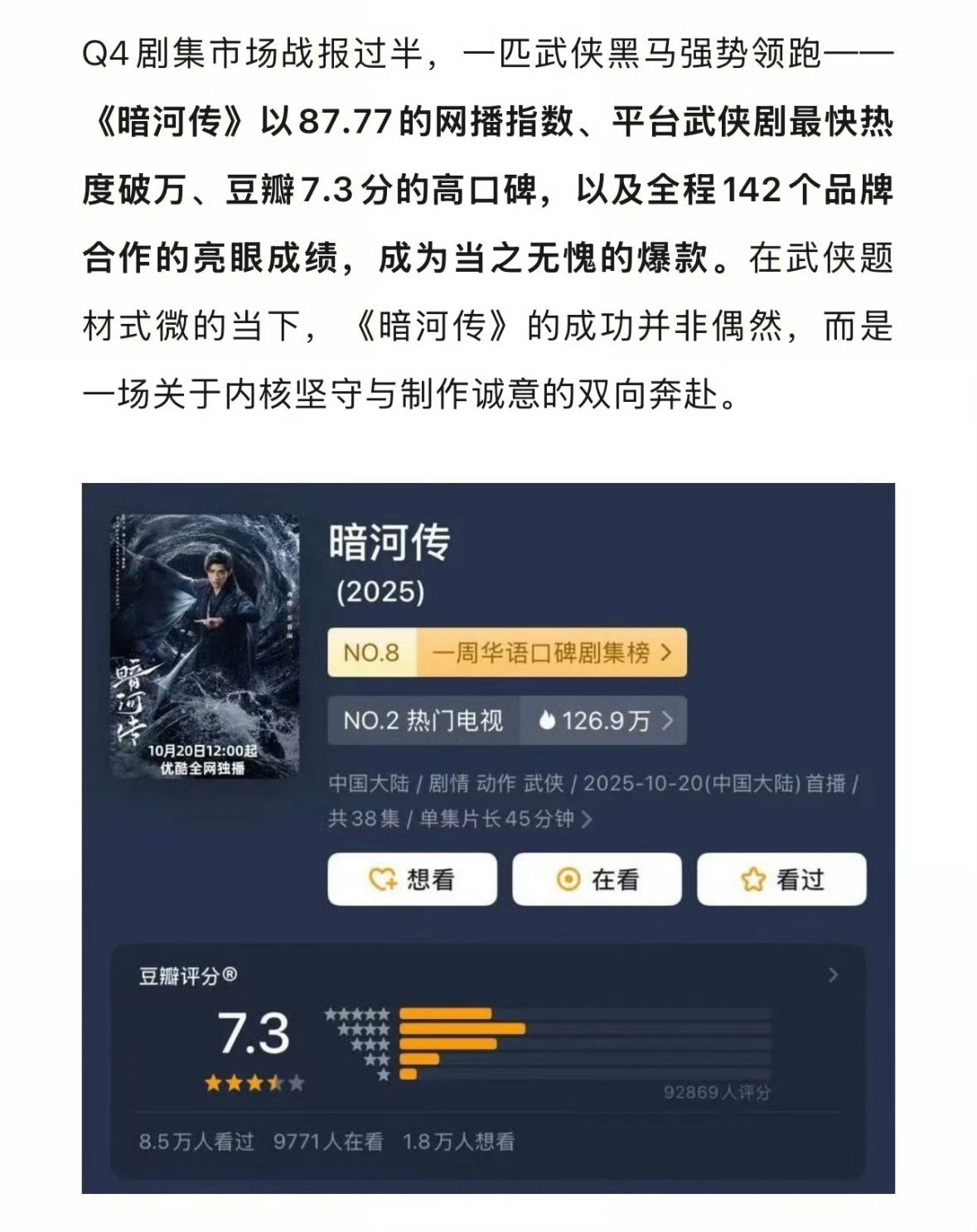 V榜认证龚俊《暗河传》是Q4黑马、爆款单品