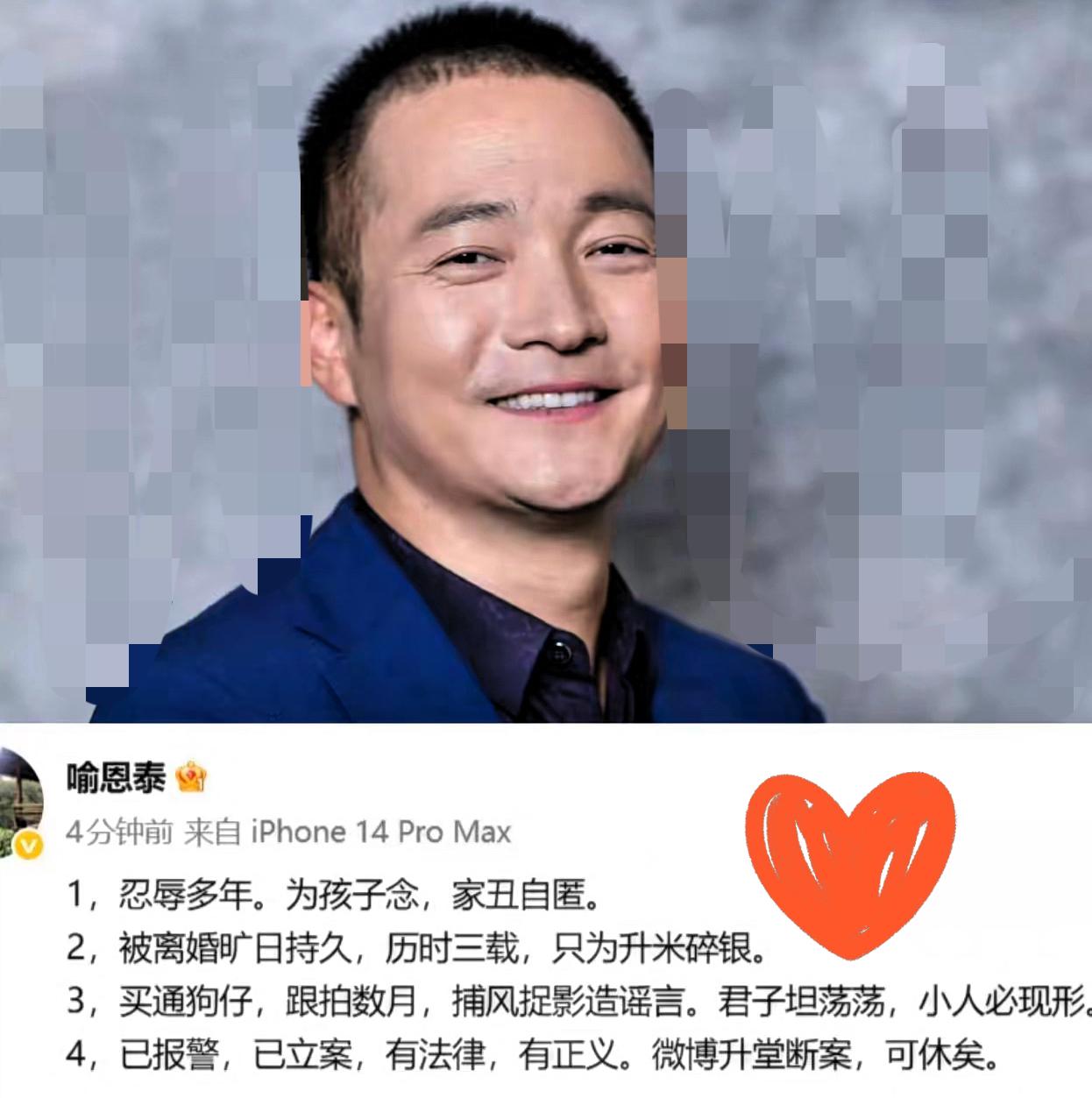 喻恩泰这波回应,总算把憋了多年的话摊开说了!翻译过来其实就四个核心,看完真挺让人唏嘘的。 他不是不想回应,是为了孩子,硬生生把家里的糟心事压了好几年。谁能想到,他才是被离婚的一方,这事儿拖了三年没个准信,说到底还是卡在资产分割上。 更让人膈应的是,居然有人花钱买通狗仔跟拍他好几个月,捕风捉影编流言往他身上泼脏水。但他也没怂,直接放话身正不怕影子斜,还拿了法律武器维权,劝网上那些乱当判官的人别瞎蹦跶。 其实明星的私人恩怨外人难断,但拿编造的流言毁人声誉就太low了。比起跟风站队,咱们不如等真相浮出水面,毕竟造谣零成本,伤害却是实打实的。 你们觉得喻恩泰的回应够有说服力吗?还是觉得这事儿背后还有隐情?评论区聊聊你的看法~