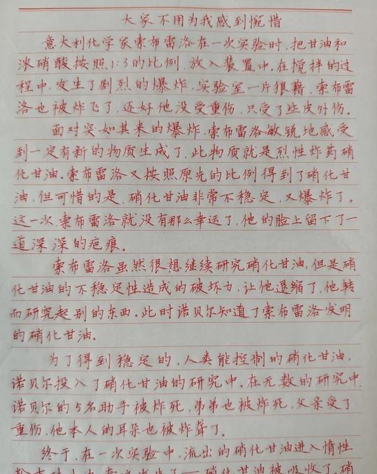 索布雷诺与诺贝尔 大家不用为我感到惋惜 意大利化学家索布雷洛在一次实验时,把甘油和浓硝酸按照1:3的比例,放入装置中,在搅拌的过程中,发生了剧烈的爆炸,实验室一片狼藉,索布雷洛也被炸飞了,还好他没受重伤,只受了些皮外伤 面对突如其来的爆炸,索布雷浴敏锐地感受到一定有新的物质生成了,此物质就是烈性炸药硝化甘油。索布雷洛又按照原光的比例得到了硝化甘油,但可惜的是,硝化甘油非常不稳定,又爆炸了。这一次,索布雷洛就没有那么幸运了,他的脸上留下了一道深深的疤痕。 索布雷洛虽然很想继续研究硝化甘油,但是硝化甘油的不稳定性造成的破坏力,让他退缩了他转而研究起别的东西。此时诺贝尔知道了索布雷洛发明的硝化甘油 为了得到稳定的、人类能控制的硝化甘油诺贝尔投入了硝化甘油的研究中。在无数的研究中诺贝尔的5名助手被炸死,弟弟也被炸死,父亲受了重伤,他本人的耳朵也被炸聋了。 终于,在一次实验中,流出的硝化甘油进入情性粉末硅土中,奇迹发生了一硝化甘油被吸收了。硝化甘油与硅土混合后,不但炸药威力不减,而且生产、使用和搬运都更加安全。至此,硝化甘油才终于能够投入生产 硝化甘油为诺尔贝带来了巨额财富,同时也让他声名远播,他被大家称为“现代炸药之父”。大家都为索布雷洛感到惋惜,因为这一切原本是属于他的。但索布雷洛只是平静地说“我要祝贺诺贝尔,大家不用为我感到惋惜,我知道我成不了他,因为我没有他那份勇气和智慧。 当我们面对别人的成功,在羡慕的同时,也要问一下自己,是不是具备别人的那份勇气和智慧 文/任万杰