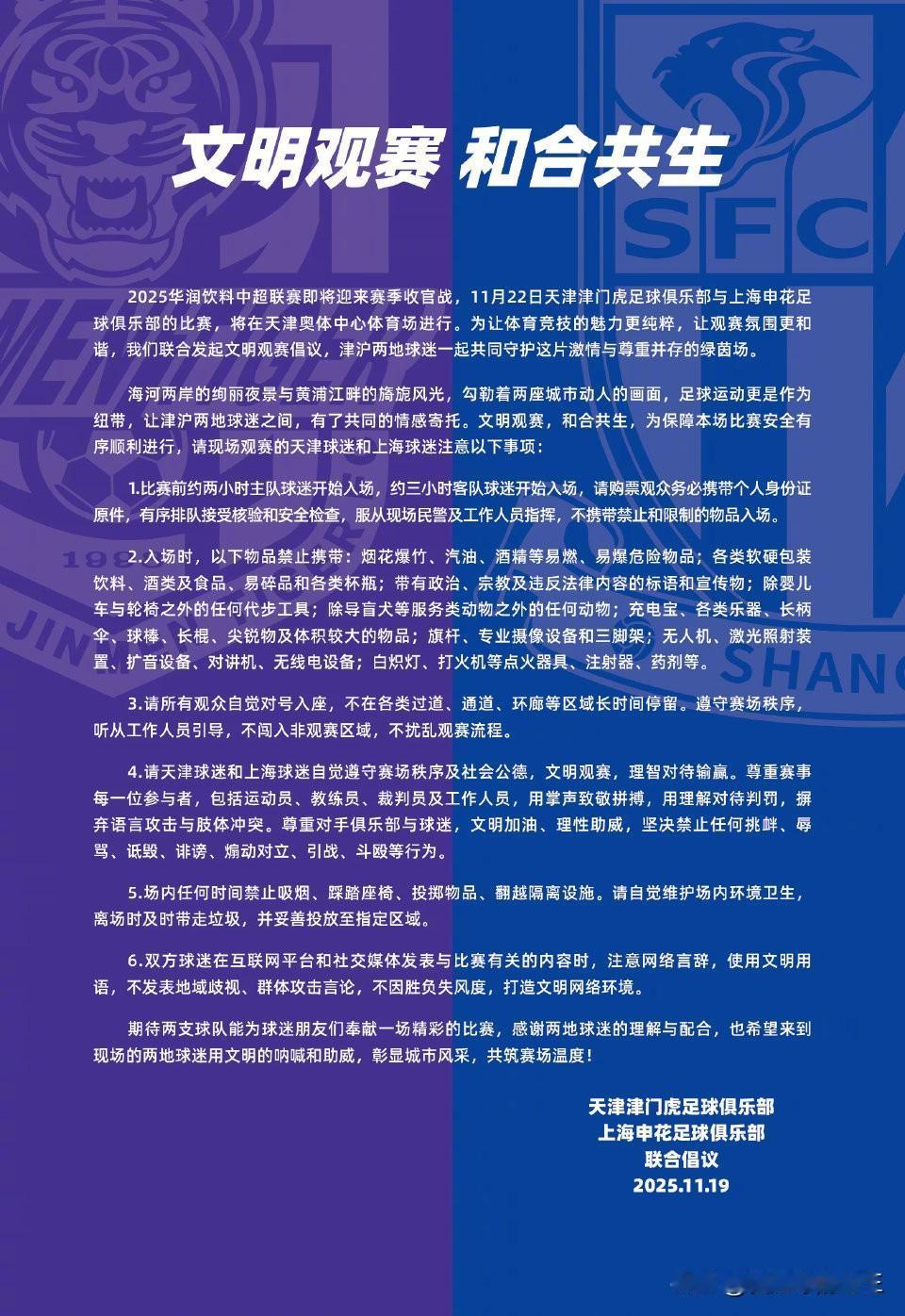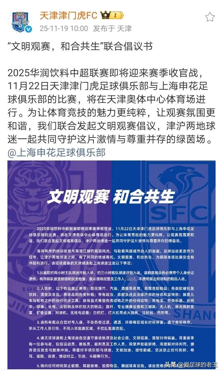 中超联赛~津沪之战前的倡议书! 随着中超联赛最后一轮的接近,本周末22日本赛季的中超联赛将画上句号! 降级球队在上轮已经产生。 而冠军之争将在最后一轮决出!而竞争的双方就是上海申花和上海海港! 众所周知,职业化以来,天津泰达和上海申花以及青岛海牛就是铁三角,上青天! 然而天津与申花的关系就在本赛季上半程被无良心自媒体给打破了,一个是坐轮椅的,一个是满嘴跑故事的! 具体原因就不说了,只说客场八万人时,主场球迷问候津门虎主帅于根伟,就已经惹怒了天津球迷!当然客观说,申花球迷还算是文明,没有太多脏字出来,但是这也不是能够接受的。 而最后一轮主场,倡议书的初衷是非常好的,但是也得让天津球迷发泄出来! 我的观点是,球场事,球场了,不要脏话,不要冲突,我们可以用文明的方式来回击申花球迷。 球场外,一起聊球,一起喝酒,都是守法老百姓! 中超联赛 中超 中超收官战 上海申花超话 上海申花 天津津门虎