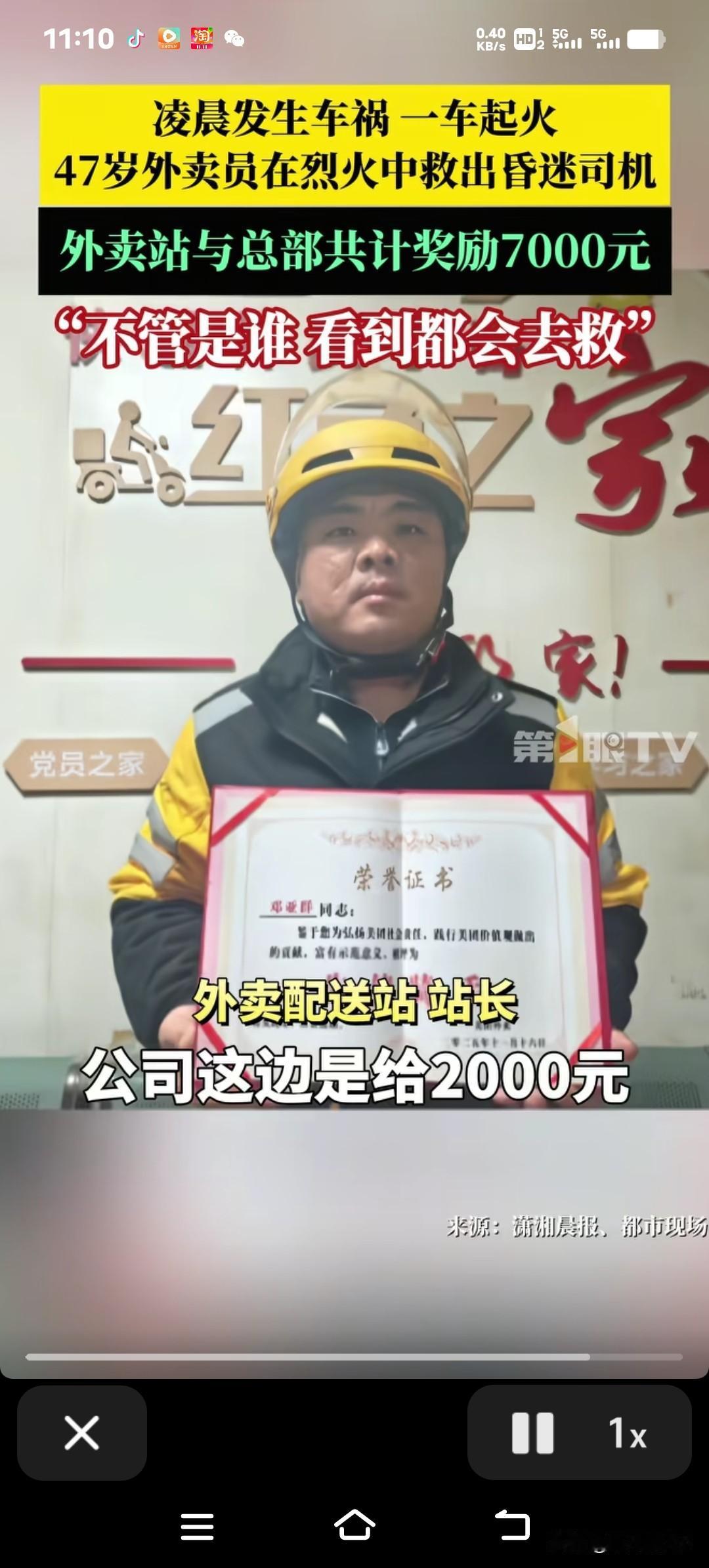 凌晨三点多的街道,突然窜起一片火光,火舌舔着夜空,外卖小哥“一头扎进”火场救人!47岁的邓亚群,大家平时都叫他“老邓”,从正在烧着的车里硬拽出昏迷的司机后,又折回去敲了敲后座车门,急得声音都发颤:“怕还有人困在里面……”谁知道,才过两分钟,整辆车就“轰”地一声,全被烈火吞了个干净。 这个送美团外卖的师傅,在站点里的兄弟姐妹们都喊他“老邓”,每天跑单量在整个站点都排得上号。他后来跟人说,当时脑子一片空白,啥也没想,就觉得车里有人,不救不行。美团那边直接奖励了他5000块,配送的公司又额外给了2000,加起来7000块呢。 更戳人心里的是,把人救出来了也没马上走,偏要再冒回火里看看,生怕里面还有人没出来。他没学过啥救援技巧,身上也没穿啥防护衣,就凭着一股子热心肠往前冲。站点的站长知道了,直接在内部群里夸他,还让大家都跟他学学这份胆子。 普通人做了不普通的事,这就是我们身边的温度啊。每次有危险的地方,好像总有人会先站出来。这样默默守护的“平民英雄”,是不是就藏在我们身边,特别让人心里暖暖的?