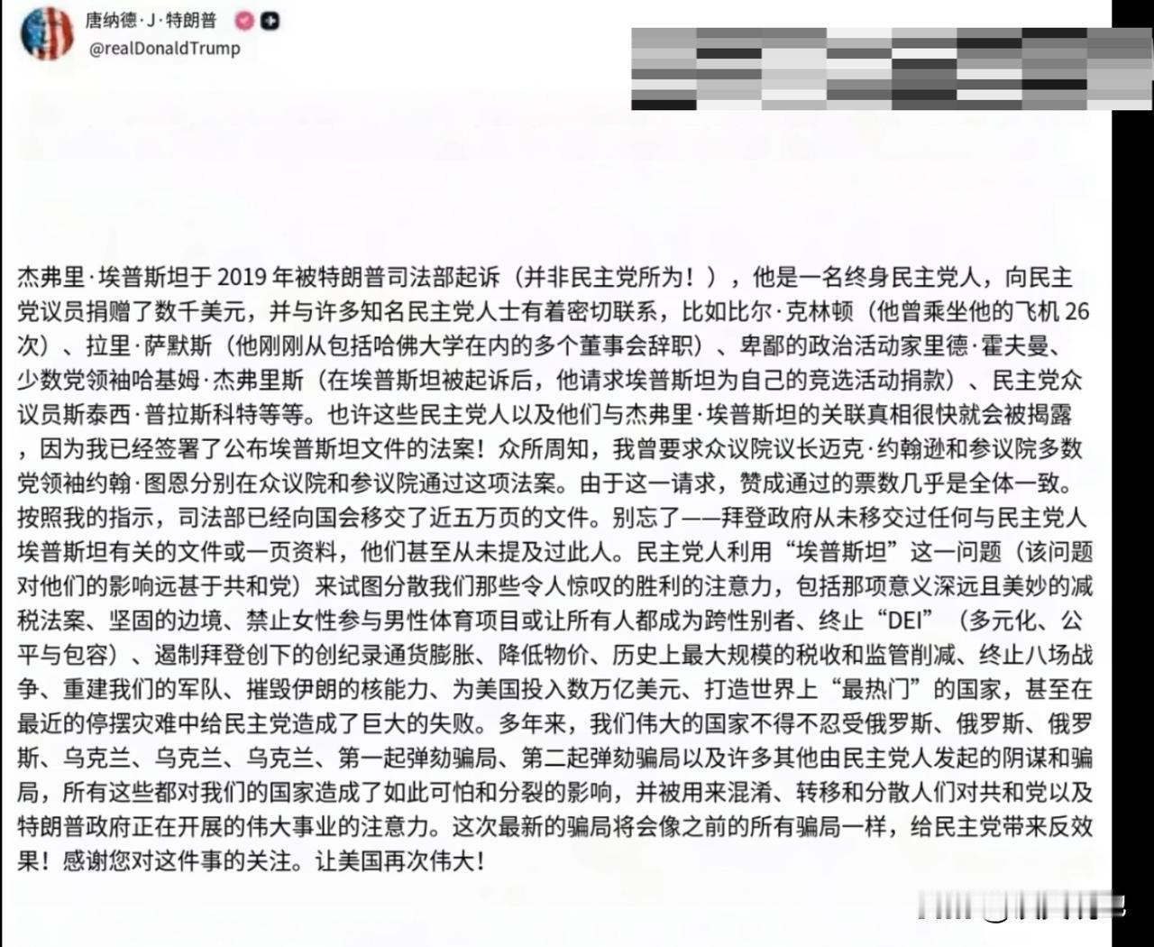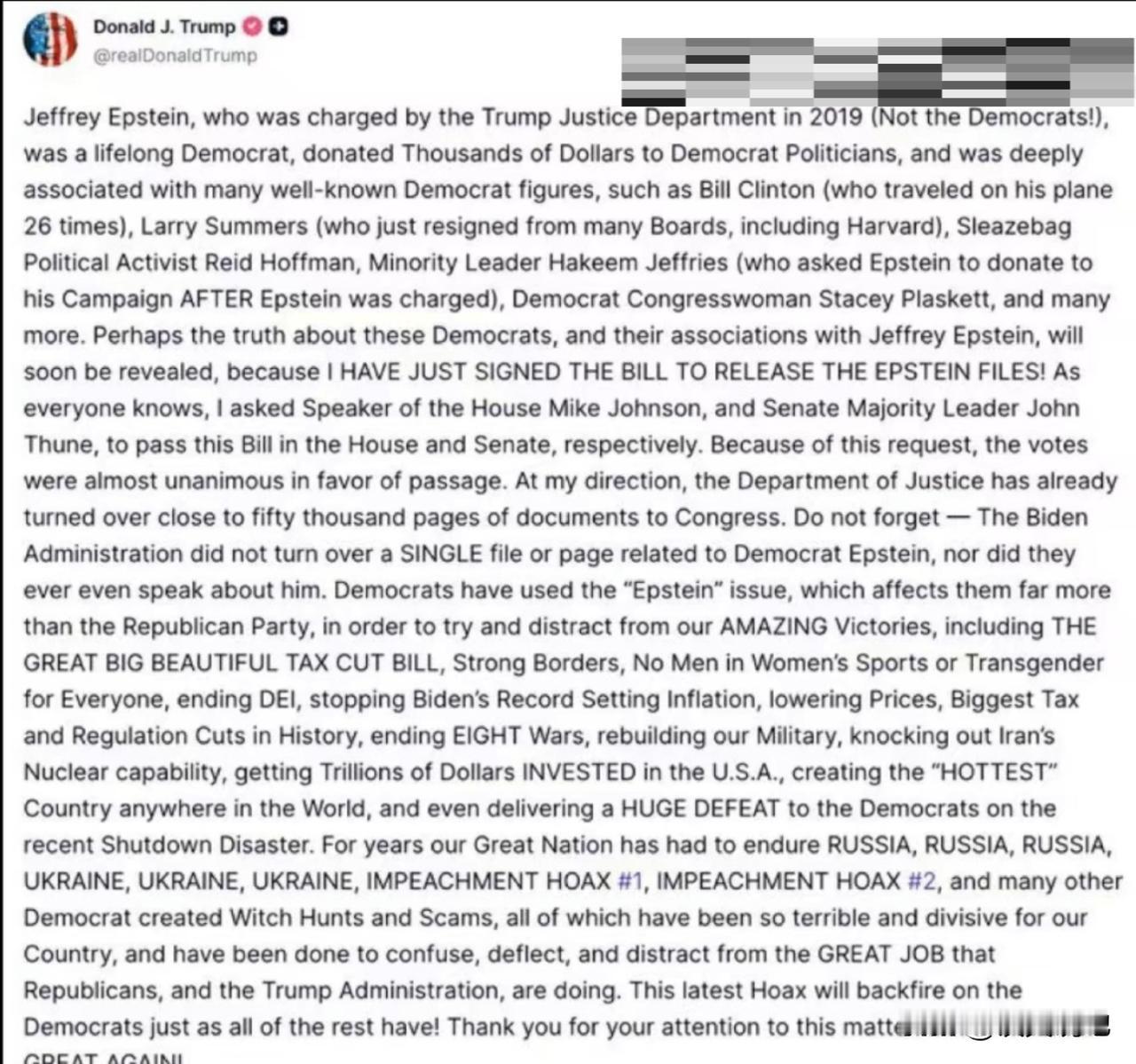 唐纳德:特朗普总统周三晚在社交媒体上发布消息称,他已经签署了国会本周通过的法案,以公布与杰弗里·爱泼斯坦有关的文件。特朗普道:"正如我周五晚上在空军一号上对假新闻媒体所说,众议院共和党人应该投票公布爱泼斯坦的文件,因为我们没有什么可隐瞒的,现在是时候摆脱激进左翼疯子犯下的民主党骗局,以转移共和党的巨大成功,包括我们最近在民主党'关闭'上的胜利。"