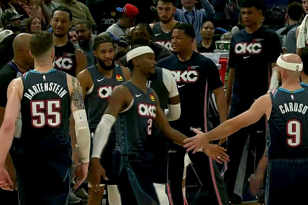 伤害性不大,侮辱性极强! 实话实说:雷霆实属有点太欺负人了,主场打鱼腩国王,每一节就领先你几分球,也不打崩你,一直给你翻盘的希望,你就是翻不过来,人家还打的无比的轻松,亚历山大(33分8篮板3助攻2抢断)也不用使出全力,一直处于划水的状态,数据拿个30分左右就得了,末节在轻松大火收汁,不得不说雷霆之所以强大,除了有稳定的攻防转换体系,就是能攻能防的人太多,这也是雷霆本赛季断档领先全联盟的优势所在! 国王我只关注威少和小黑的表现,威少还是全能的那个威少,首发7分10篮板6助攻3抢断,从全队最高的篮板球,就可以看出有多积极,在说下小黑,小黑首发一直拉胯到极致,不可思议的是自从到了替补以后,好像打通了任督二脉一样,状态爆棚,21分5篮板3助攻!国王论战绩那是差的很,要是论谁打的最热闹,那必须是国王的这奇葩阵容了!最终雷霆轻松7连胜,国王无奈7连败! 雷霆队阵容 雷霆