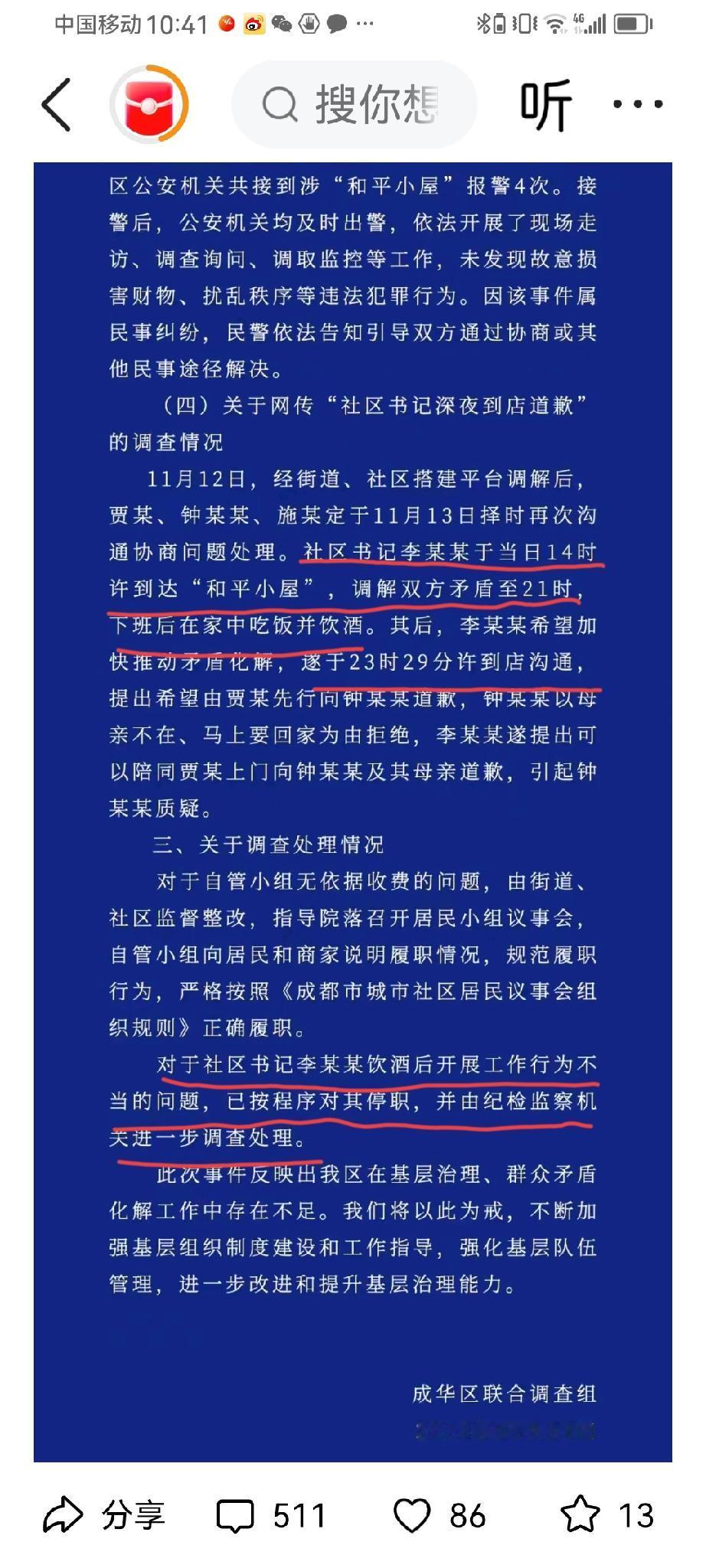 我就想不通调解“和平小屋”纠纷的社区书记何错之有?根据情况通报,社区李书记从下午14时到“和平小屋”直到夜里21时下班,然后“下班后在自己家里吃饭并饮酒”。对于李书记饮酒后又开展工作的不当行为,按程序停职并由监察机关进一步调查处理。首先李书记工作兢兢业业,尽职尽责,任劳任怨的连续工作了7个小时,中间没有休息吃晚,何错之有?其次是李书记是在下班后在自己家吃饭饮酒,既没有公款吃喝,也没有吃请服务对象,何错之有?第三李书记在回家吃饭后又自愿连夜加班加点工作何错之有? 如果像李书记这样一心扑在工作上,只有上班时间,没有下班时间,心里装着社区居民,帮助社区居民调解工作,只是因为加班加点工作后在自家吃饭饮酒填饱肚子解乏,为了工作又继续连续加班加点工作,又不是在工作日,也是违反了党纪党规,还要受到处分,岂不是要含了兢兢业业工作的社区工作人员的心?是不是不准社区干部加班加点工作?