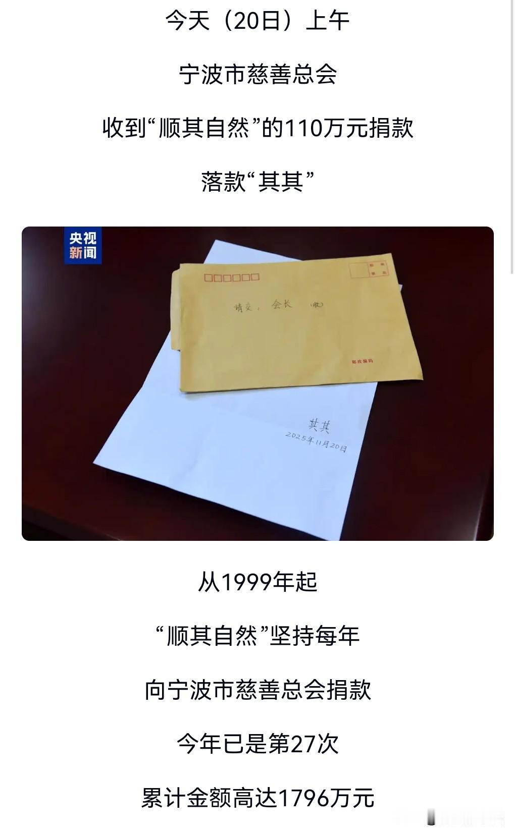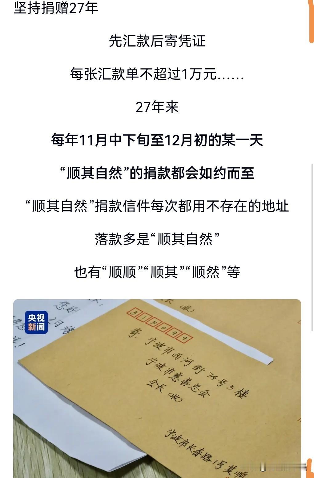 这真的是太让人敬佩了。做好事从不留名,这才是真正的做好事。 做好事留名,有的是为了名气和口碑。 有一个署名叫顺其自然的,27年匿名捐款。 累计捐款已高达1796万。 这才叫正能量。 这样的善举真的是冬天里的一抹阳光。