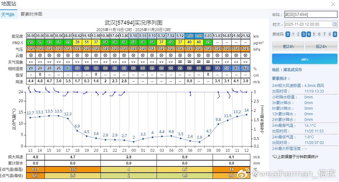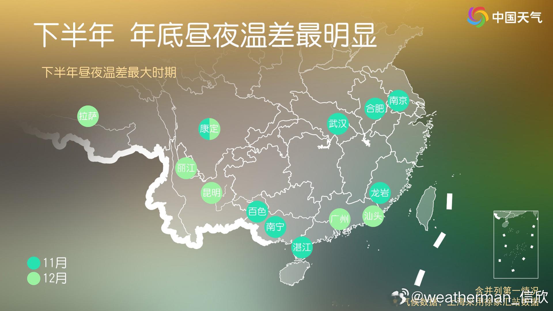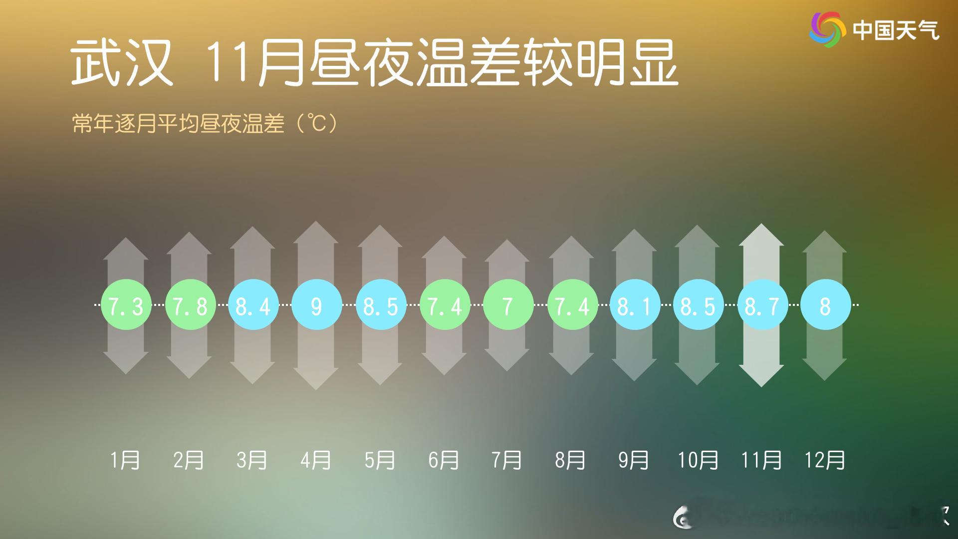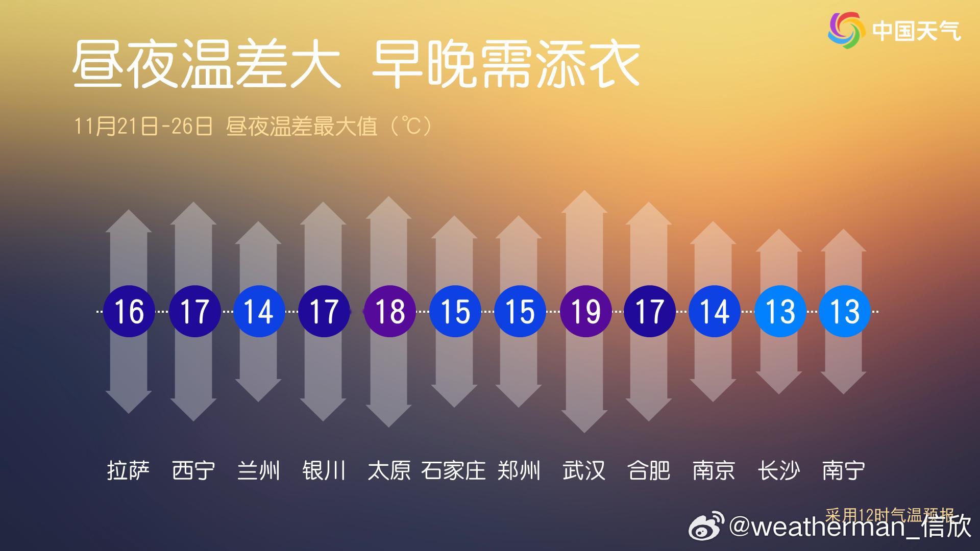 【昼夜温差大】今天我国大部地区天气晴朗,使得昼夜温差加大。武汉今天7时1.9℃、12时已经14℃,下午气温继续上升,全天温差可达15℃以上。未来几天,我国多地的昼夜温差还会超10℃甚至超15℃。往年11月,因为夏季风撤退后,南方晴朗干燥的天气变多,因此11月是南方不少城市下半年昼夜温差最大的月份。