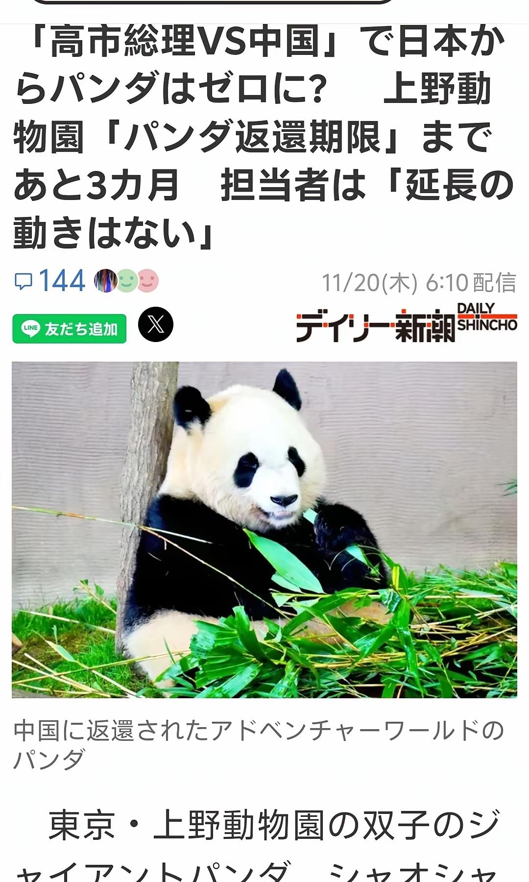 最新消息,在日本的两只大熊猫即将回国, 既然日本做的这么绝,好吧,我们先让我们的国宝回家。 看到计划,这两只熊猫是在计划明年的2月份才回家,如今却突发情况,提前踏上回家的路程。 晓晓和蕾蕾是两只熊猫的名字,他们在东京上野动物园中居住,两只熊猫踏上回家的路程,当这两只熊猫离开日本后,日本就再也没有大熊猫了。 也就是说现在的日本想看熊猫只能在手机上看了,这日本是从1972年首次没有大熊猫的存在,而日本也是知足吧,除了中国外,大熊猫在日本呆的时间最长的国家之一。 都是高市那张嘴,让日本被中国所制约,但是仍然是嘴硬,想和中国死磕到底,这么说那你就等着后悔,对此你们怎么看?