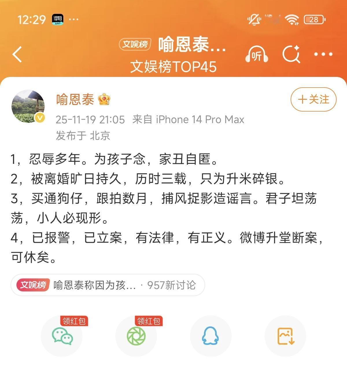 喻恩泰深夜突然发文回应婚变争议,直言忍辱多年皆为孩子,态度刚硬不拖沓。 此前被传婚变、停付抚养费还转移财产,全网争议不断,他人设接连受挫。此次他直接澄清是被离婚,拉扯三年没公开家丑全顾着孩子,还吐槽对方买通狗仔跟拍造谣,现已报警立案,明确拒绝舆论拉扯。 孰是孰非难下定论,还是静待司法结果更靠谱。 声明:本文仅基于公开信息整理,不站队任何一方,观点不代表事实,具体真相以司法结果及当事人官方回应为准。喻恩泰