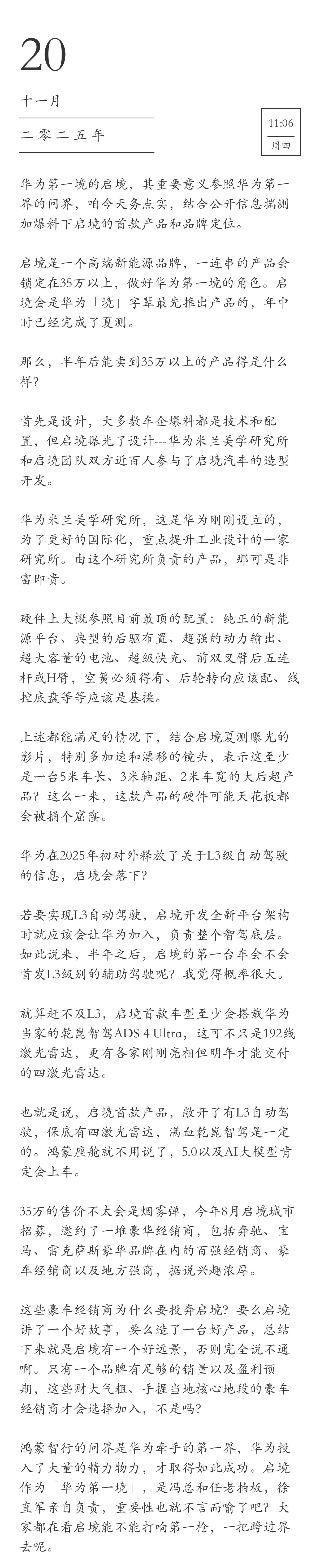 关于启境,也就是华为第一境,许多人都表达了看法。我们来点干的,猜猜启境未来的产品和规划...