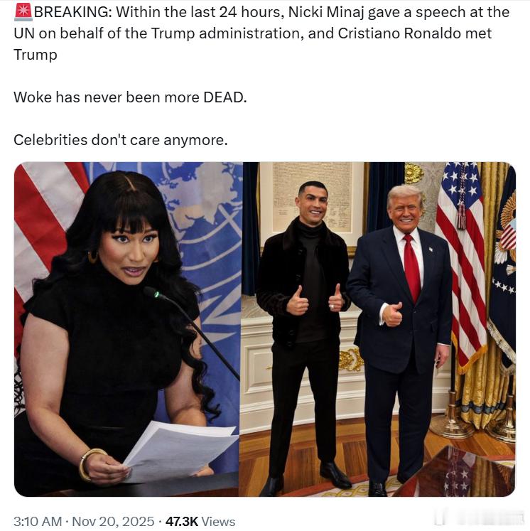 在过去的24小时内,妮琪·米娜代表特朗普政府在联合国发表了演讲,而克里斯蒂亚诺·罗纳尔多也与特朗普见面了。“觉醒”从未像现在这么 彻底凉透。名人们已经不在乎了。
