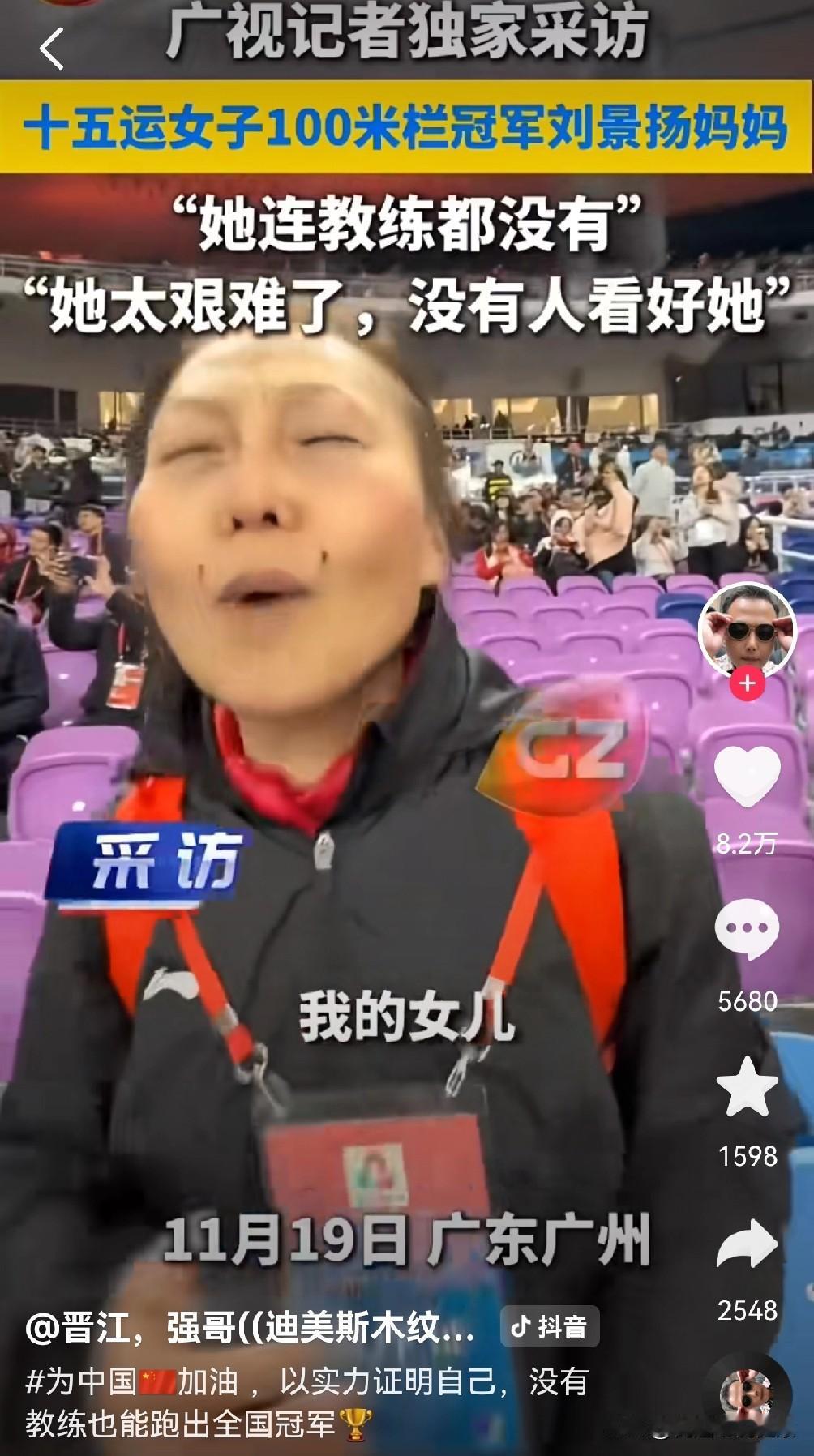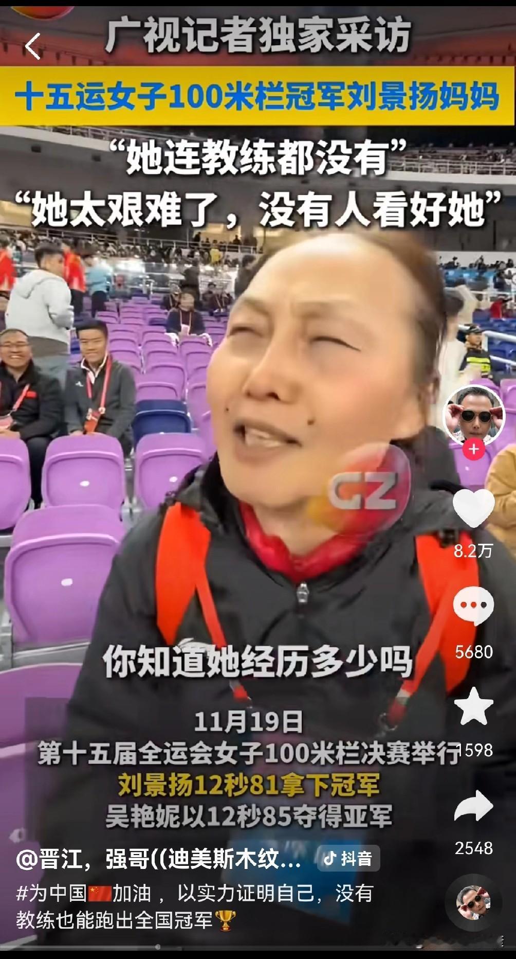 无专属教练+三战全运!广东姑娘刘景扬12秒81逆袭夺冠,黑马之路看哭全网! 全运会女子100米栏决赛爆出超级大冷门!广东姑娘刘景扬以12秒81刷新个人最佳,力压吴艳妮、林雨薇两位夺冠热门,摘得金牌。这枚奖牌背后,是她13年田径路的孤勇坚守。 没有专属跨栏教练,她跟着三级跳教练摸索四年,自己看录像抠动作、记技巧;队友练5组栏,她加练到8组,膝盖积水也咬牙坚持。前两届全运会,她连决赛都没能闯进,省队冲金名单里压根没她的名字,外界质疑声不断。 决赛场上,她起跑反应0.207秒排名垫底,却凭借完美栏间节奏后程狂飙,最后10米绝杀对手。冲线后,她第一时间扑向看台的妈妈,母女相拥大哭。 “我用青春做了场自我实现的梦!” 这位不被看好的黑马,用20年坚守和死磕到底的韧劲,在自己的赛道上圆梦巅峰,也让无数人看到:平凡人的坚持,终将绽放光芒。