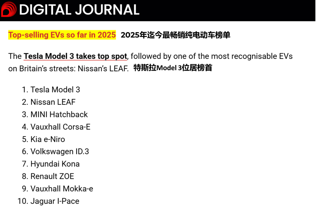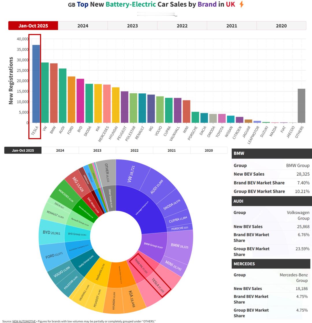 Model 3拿下英国1-10月纯电动车销量冠军!根据海外博主electric_nick_的统计,特斯拉今年1-10月在英国累计销量超3.7万辆,是宝马的1.3倍、奥迪的1.4倍、奔驰的2倍。具体到车型来看,英国汽车交易平台cinch.co.uk提供的最新销量数据显示,特斯拉Model 3超越众多欧洲本土品牌车型,成为今年目前最畅销的纯电动车。特斯拉等纯电动车的热销,正加速推动替代传统燃油车的进程。相比2024年8月,英国纯电动车市场占比已从10%提升至如今的16%。交易平台cinch.co.uk的纯电动车业务负责人表示,当地消费者对纯电动车的青睐,从二手电动车市场表现也可见一斑。目前,该平台售出的二手车中,每六辆就有一辆是纯电车,且市场接受度每月都在提高。