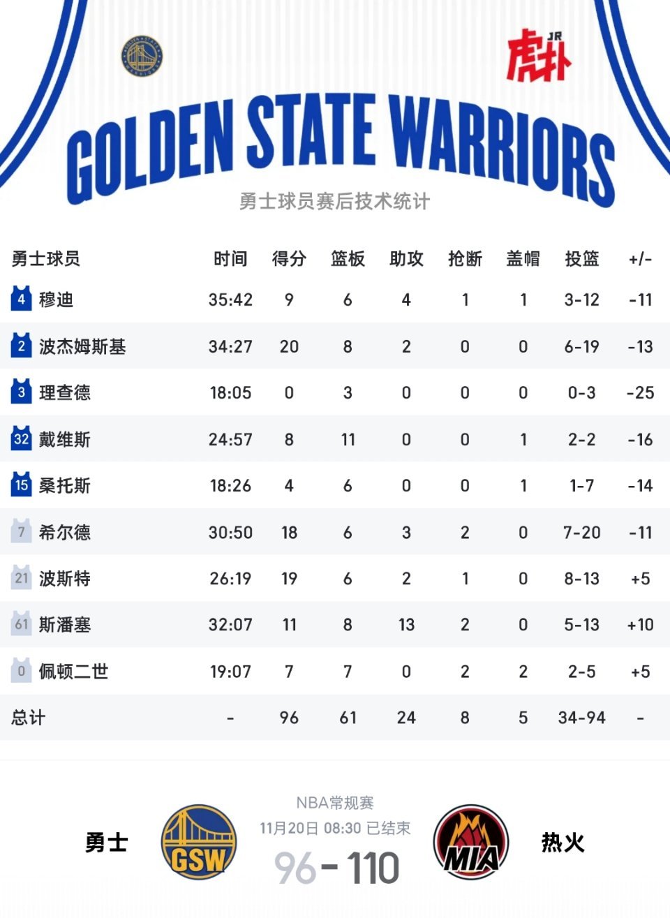 过程有点跌宕起伏,结果不出意外,几大主力缺阵,勇士客场96-110负于热火。看看数据,有没有什么亮点?