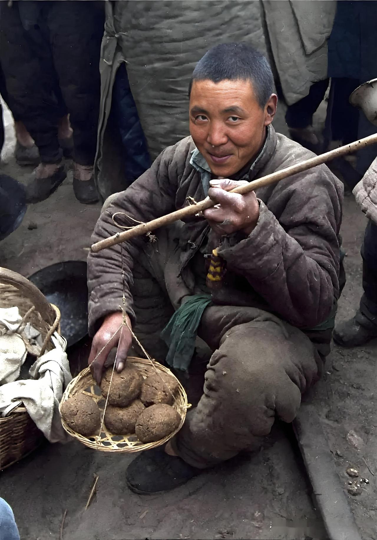 1942年,河南,一名男子穿着补丁摞补丁的破旧棉衣,蹲在泥泞的地面上,手持一杆简易的秤,秤盘里摆放着几个粗糙的糠窝头。他的衣着和神态尽显饥寒交迫,周围还能看到其他灾民的身影,一旁的篮子里似乎是仅有的家当。 当时河南因天灾人祸粮食绝收,数百万民众挣扎在饥饿边缘,绝大多数人自身都缺衣少食、身无分文,根本无力购买;而这些糠窝头本身也是用粗粮甚至树皮、糠麸混合制成,营养价值极低,是灾荒下迫不得已的 “食物”,非常不好卖。